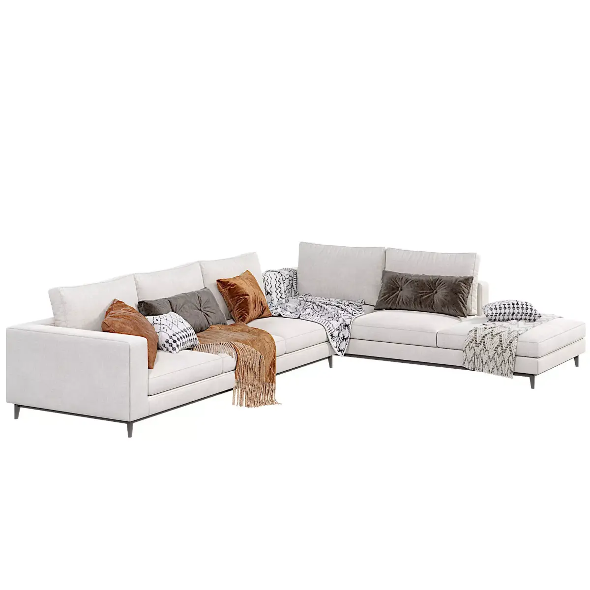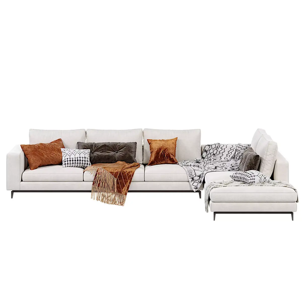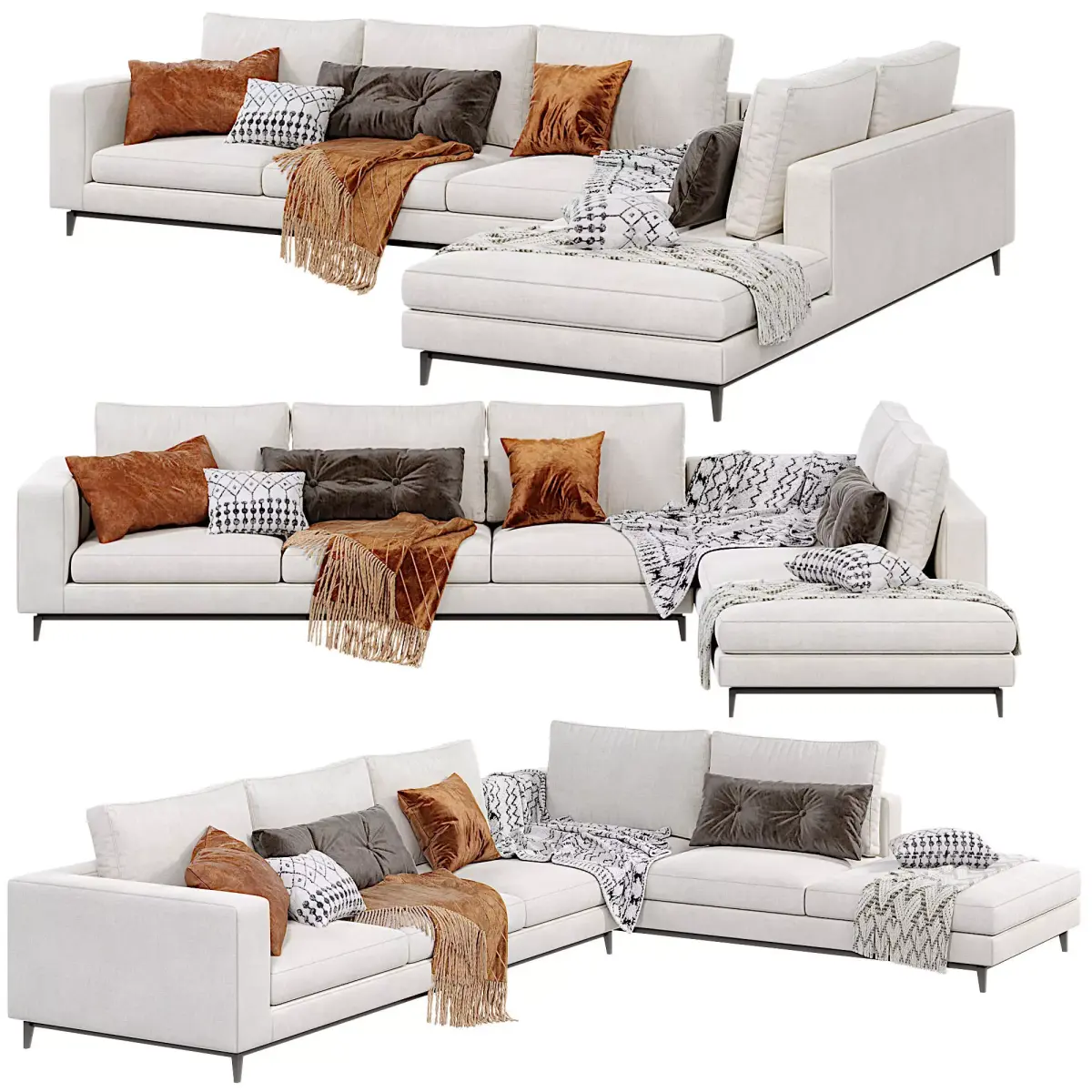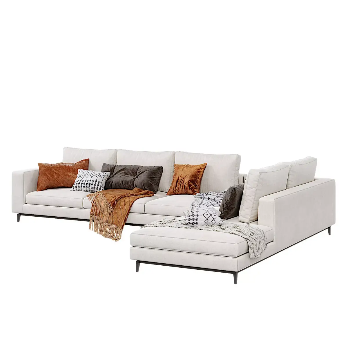 Bring timeless elegance to your renders with the Minotti Andersen Sofa, a premium-quality 3D model crafted for photorealistic interiors. Designed in light beige upholstery with sleek metal legs, this Scandinavian-inspired sectional features perfectly modeled details, soft decorative cushions in rust orange, dark brown, and black & white patterns, plus realistic knitted throws for maximum visual impact.