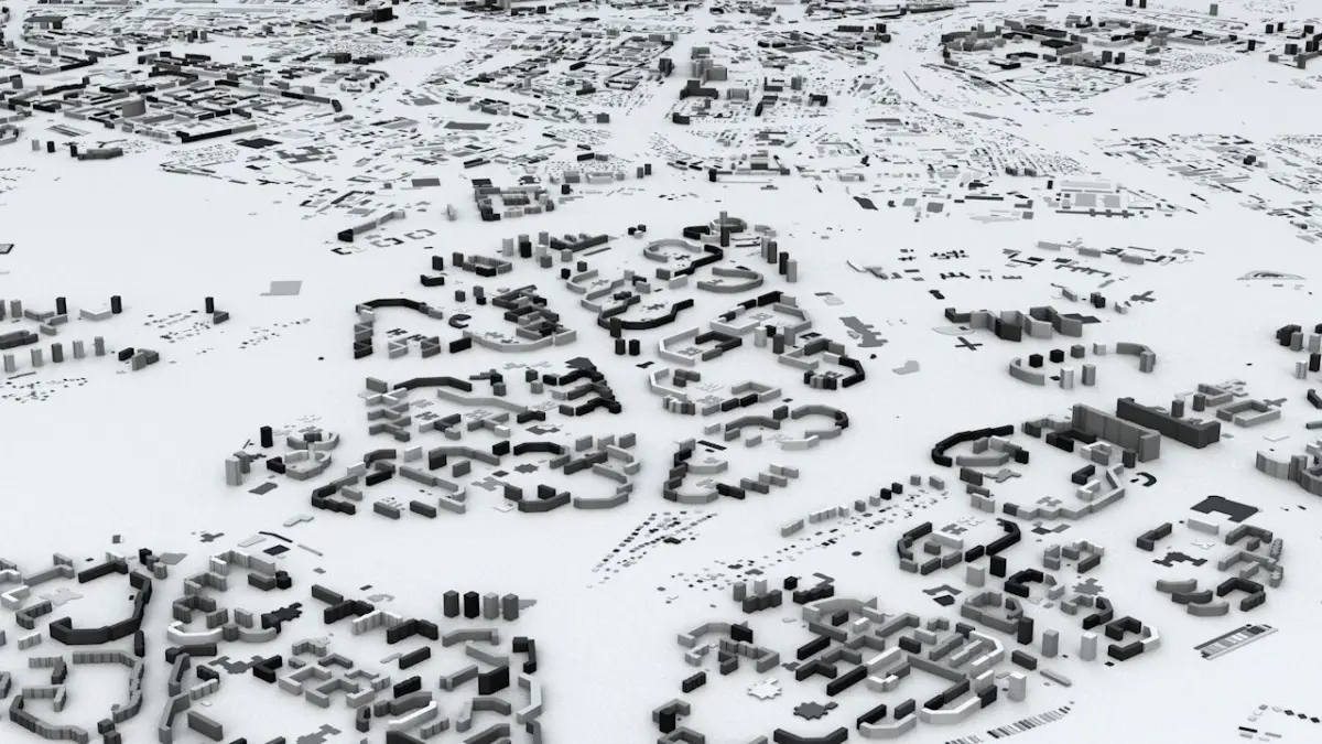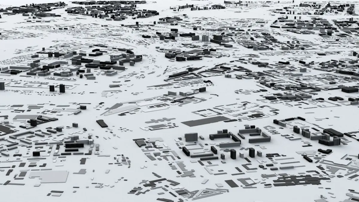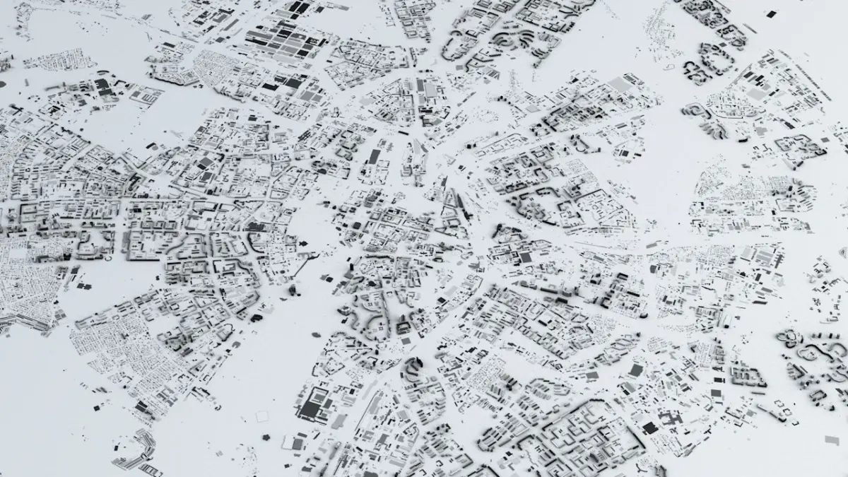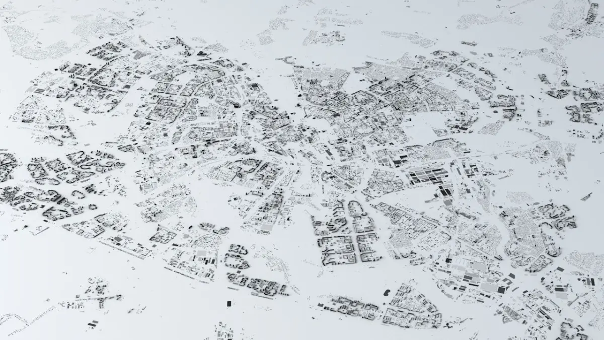 - the model is positioned on a flat surface (all buildings are on the “floor” - no elevation data included)