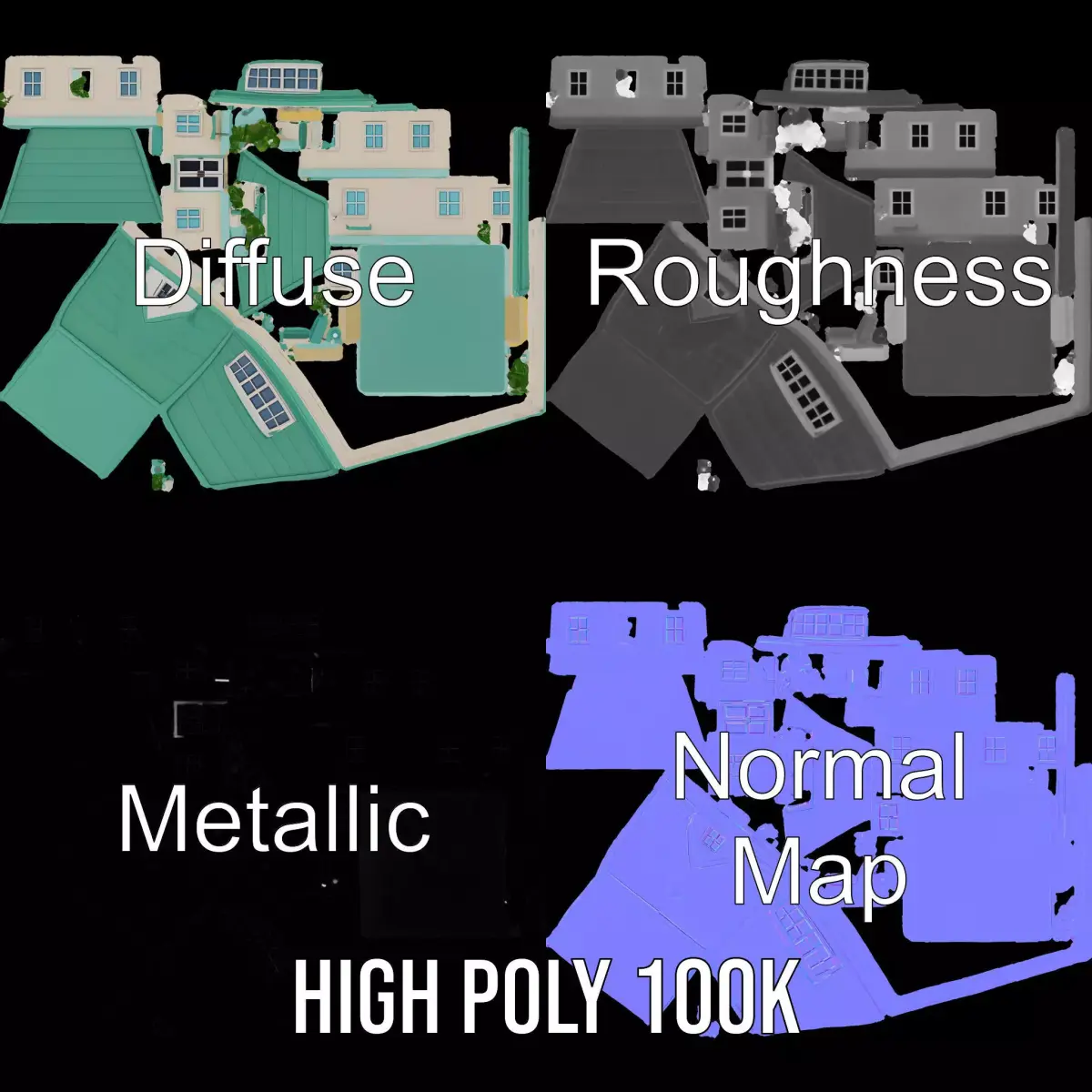 The Mint Green Cottage model pack offers a charming, quaint design ideal for architectural visualizations, game environments, and animation scenes. This model features a sloped green roof, numerous windows for realistic facade detailing, and includes detailed textures for added realism. Each model has 3 levels of detail: low-poly (1000 triangles for mobile), middle-poly (10,000 triangles for environment), and high-poly (100,000 triangles), which allows for the use of this model in production rendering (such as 3ds Max, Maya, Cinema 4D, Blender, Vray/Corona/Cycles and all others), game engines (Unity and Unreal compatible), and interactive presentations, providing a choice of detail based on the LOD System principle. The model's textures are PBR, Diffuse, NormalMap, and reflection/roughness/metallic, which are suitable for any modern rendering engine. All models are accurately unwrapped and have no overlapping UV. All textures are 4096*4096 in size. Please like and leave a comment for the model if you liked it.