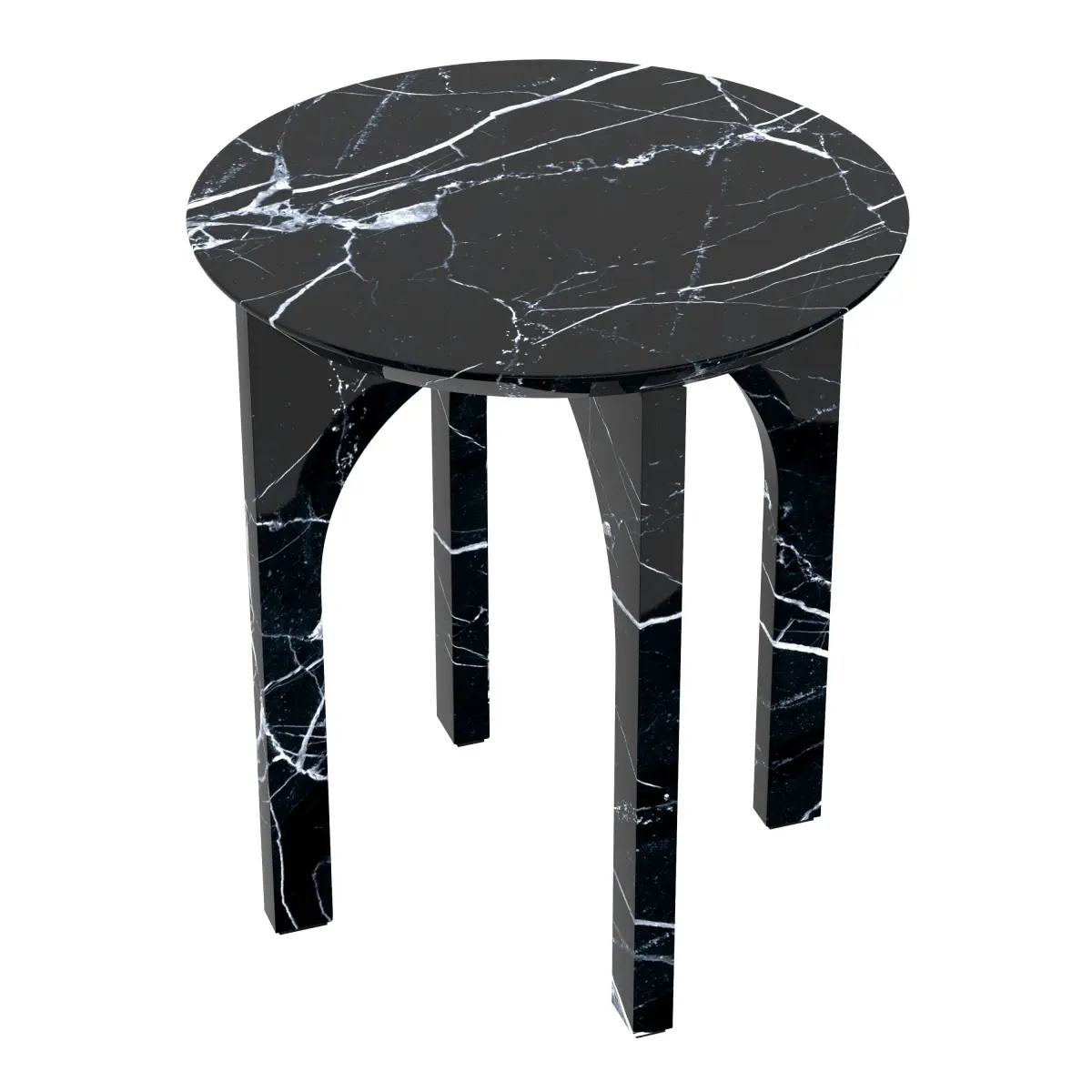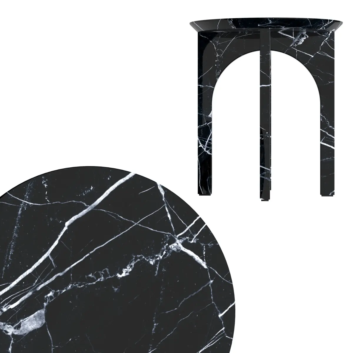 Low tablecomposed of a round top made of treated marble, supported on four legs of thesame material in the shape of two pointed arches.