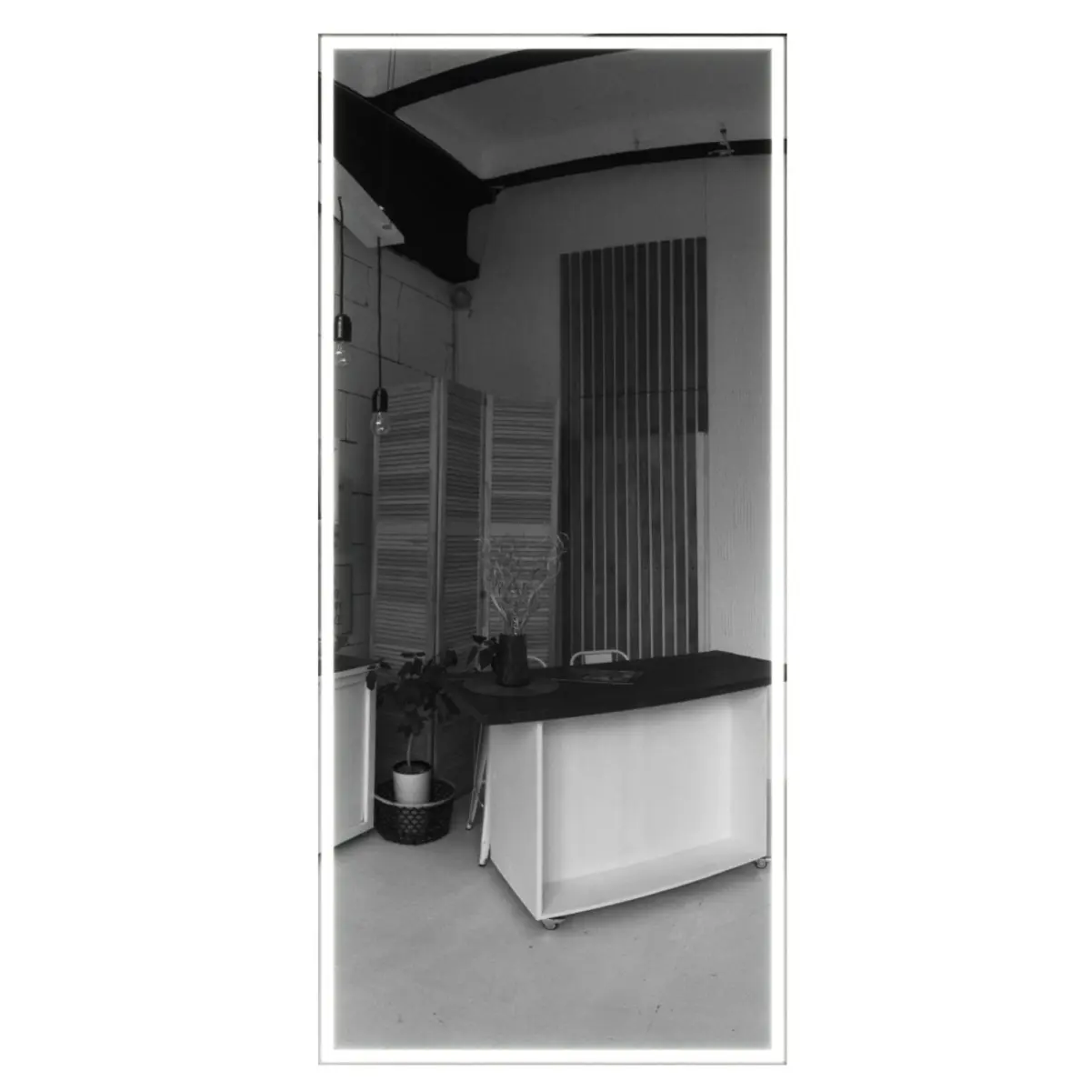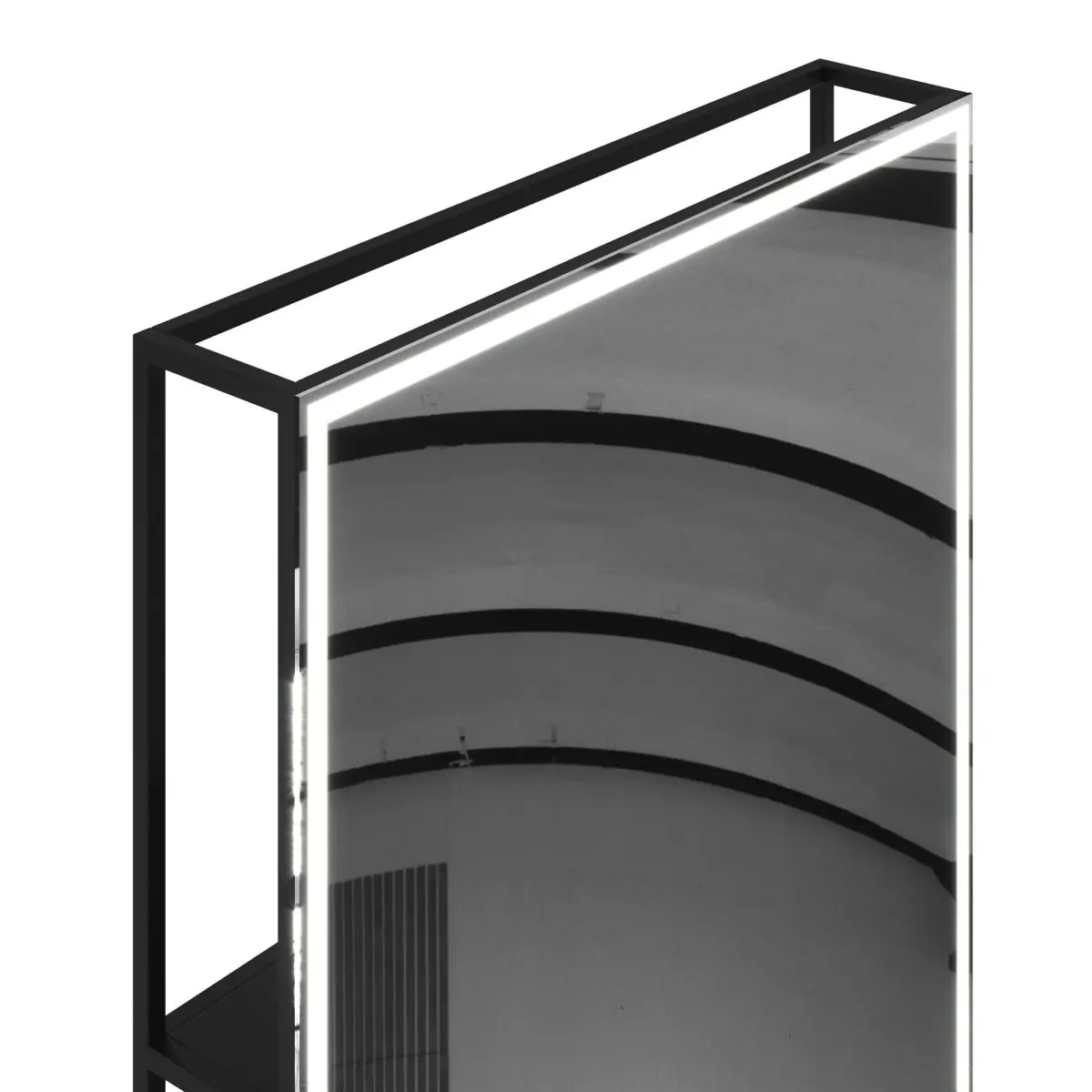 A modern steel mirror for Barber Shop with LED Stripe and shelves on back side.