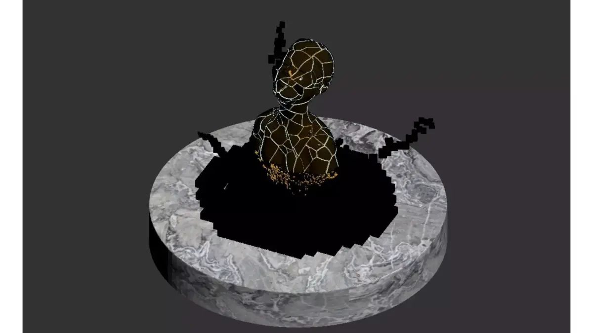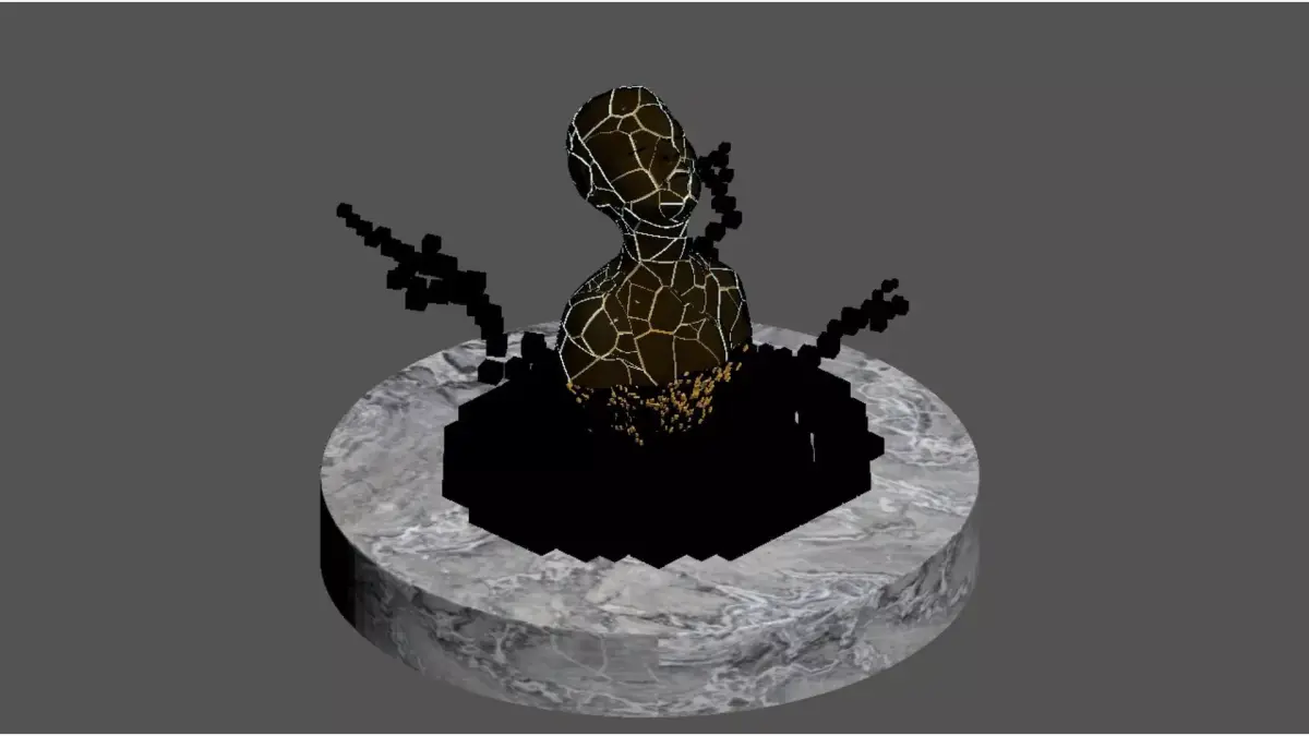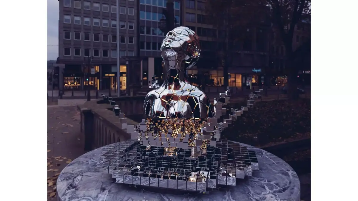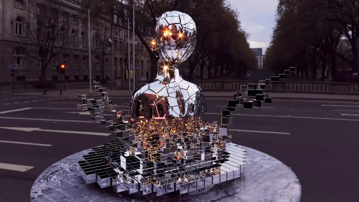 This is a futuristic installation art piece. Its main body is a human figure sculpture assembled from mirrored metal blocks, whose surface is deconstructed and reorganized like broken pixels, reflecting the surrounding urban environment and light. A warm glow emanates from the neck area, resembling a visual representation of data flow.The sculpture sits on a grid-patterned metal base, and the entire piece hovers above a stone platform beside an urban water feature. The background features an autumnal, bleak tree-lined path and buildings. The cold, rigid metallic texture creates a striking contrast with the soft natural and urban landscapes.The work combines the sci-fi vibe of cyberpunk and the fragmented aesthetics of deconstruction, serving as a visual expression of the integration of humans and technology in the digital age.