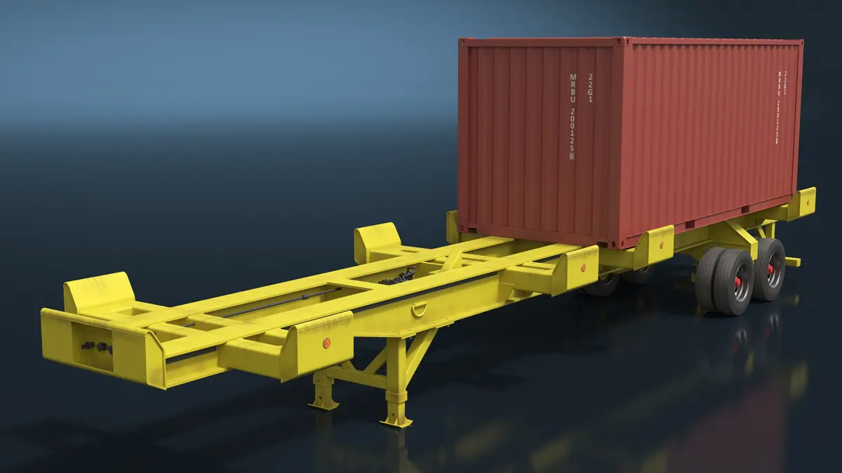 Missile Launch Container on Trailer Rigged is a three-dimensional model of a mobile missile launch system housed within a standard shipping container, mounted on a transport trailer and fully rigged for animated deployment.