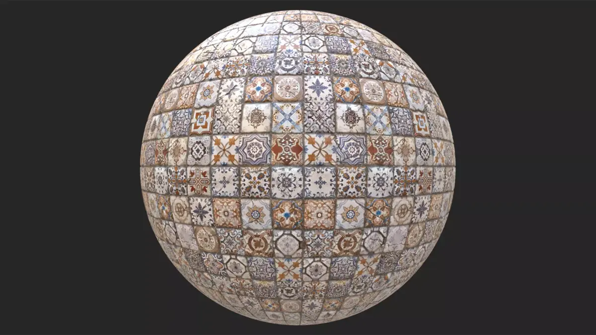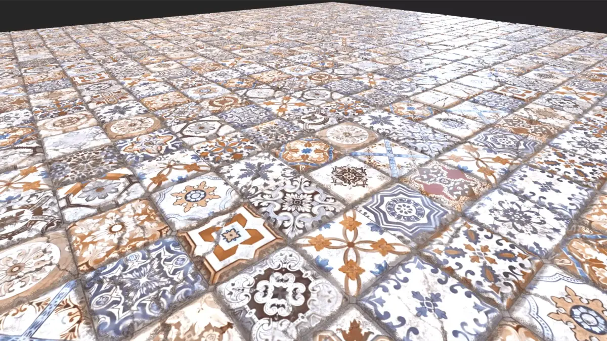 Enhance your projects with these handcrafted-style, high-quality mixed pattern ceramic tiles. Featuring a diverse collection of traditional Mediterranean and Azulejo motifs in blue and ochre tones, this material is perfect for architectural visualization and historical environments.
