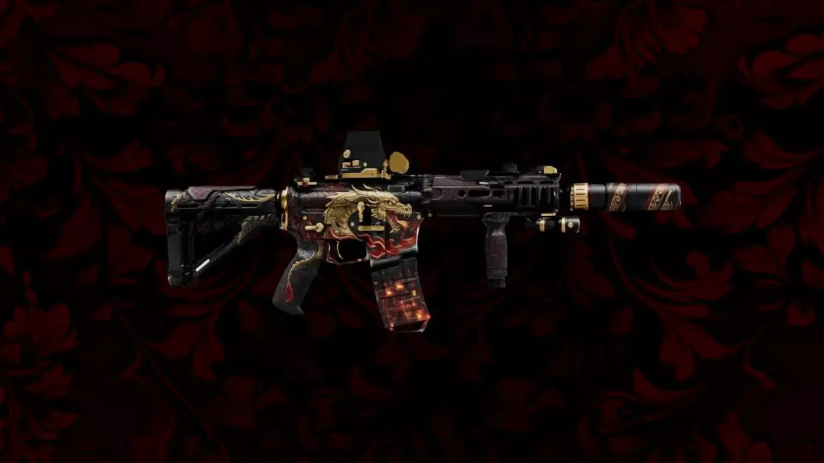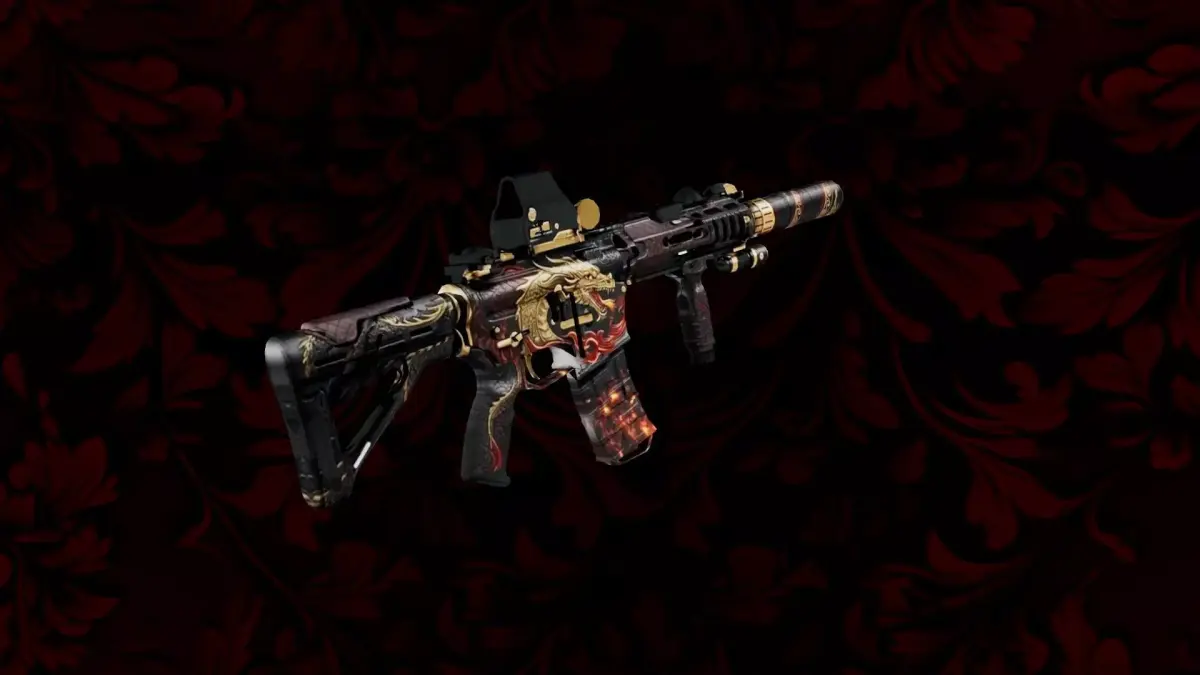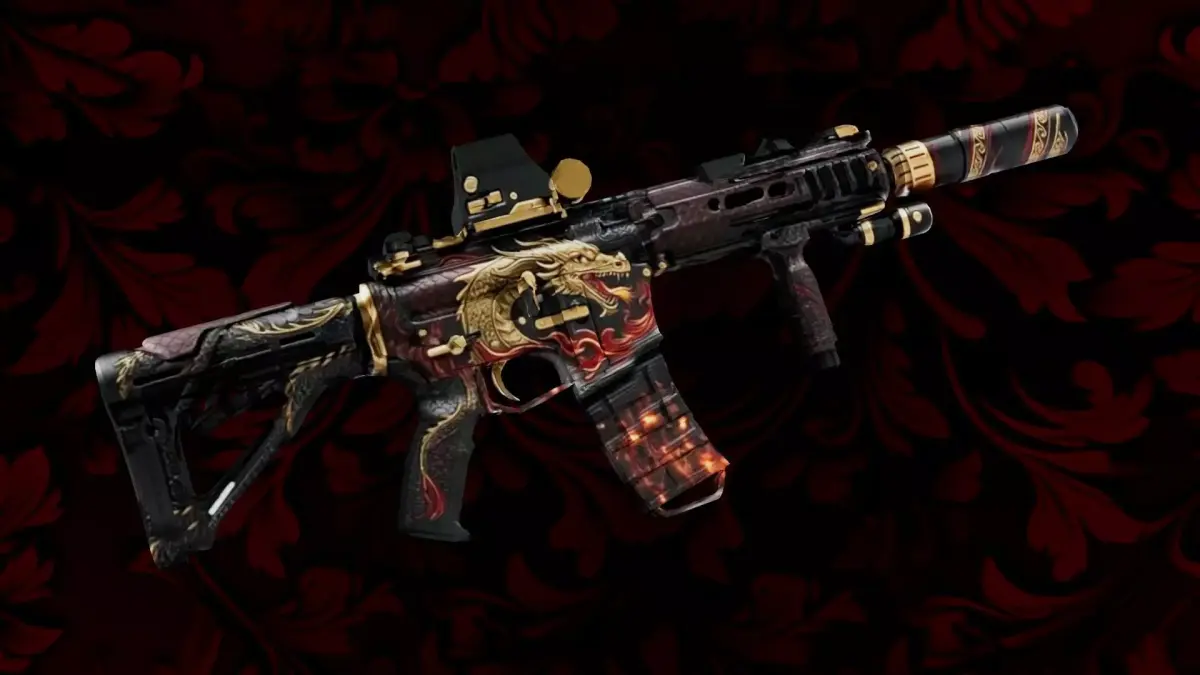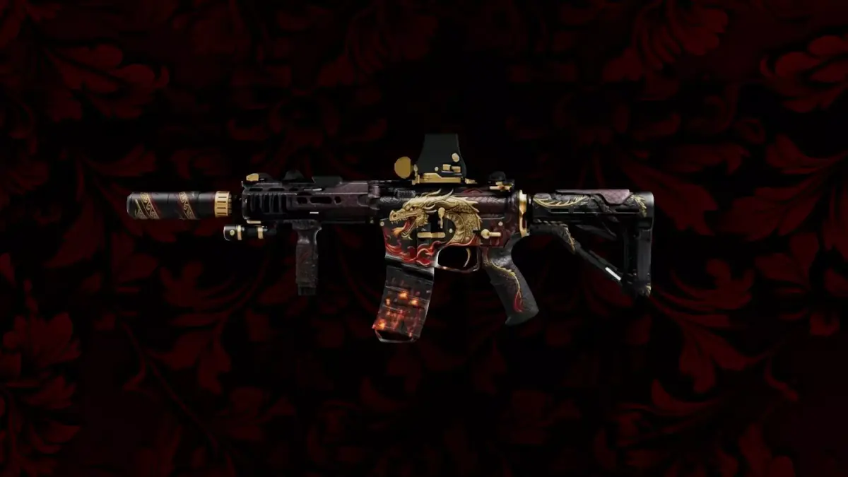 Custom Dragon Skin: Unique, ornate dragon engraving with gold accents and fire-themed magazine.