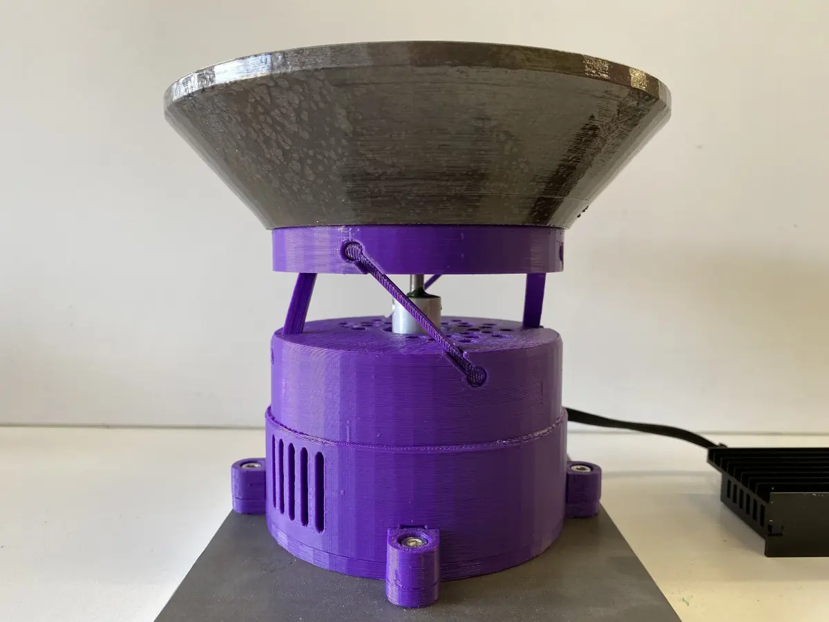 Instead of using a DC motor, this one uses a Nema17 stepper motor for excitation. This makes tuning the amplitude and frequency of the bowl a much simpler and more reliable process.