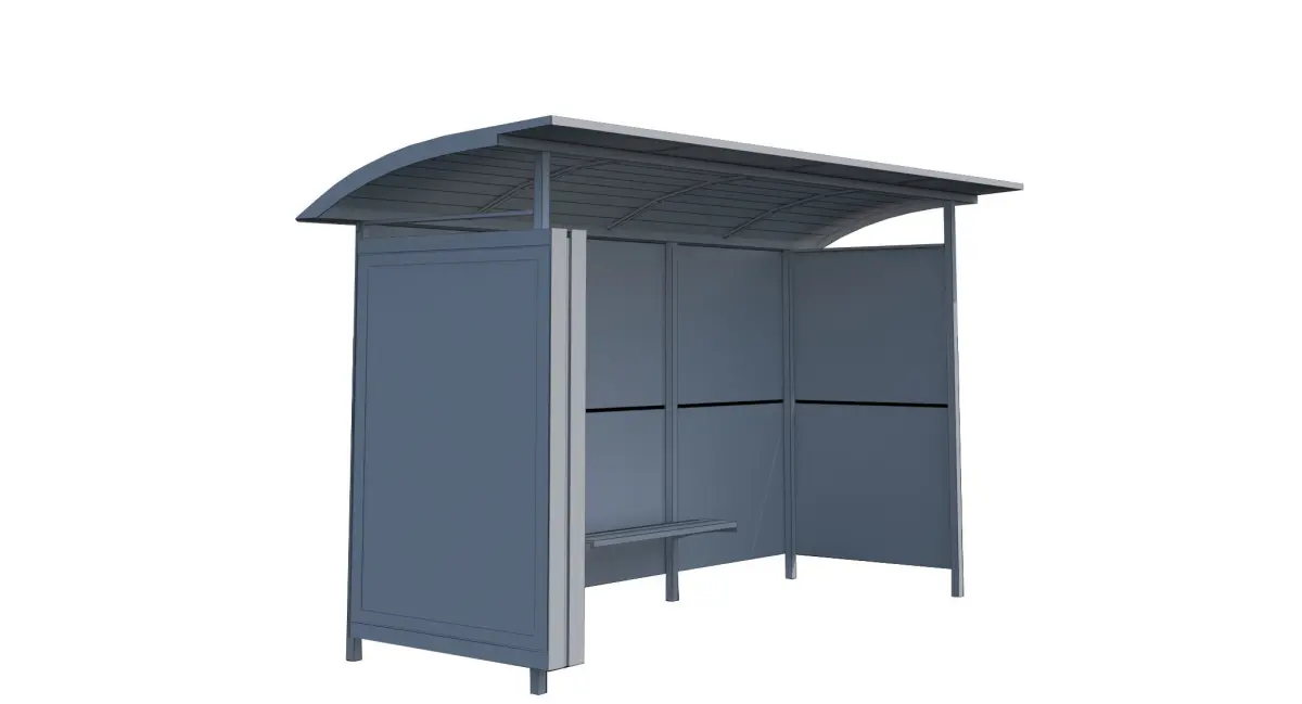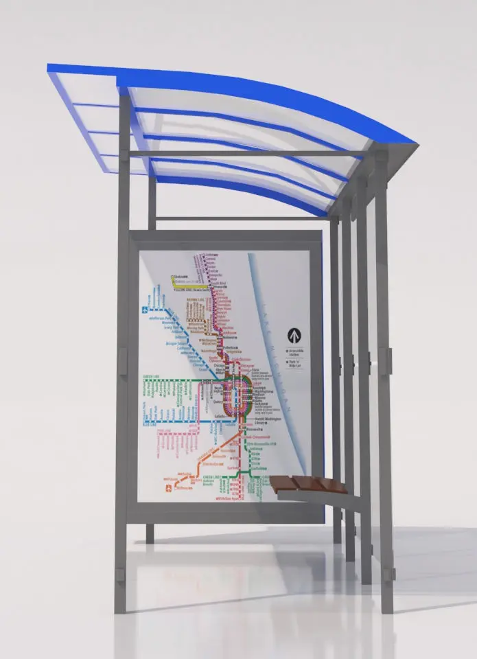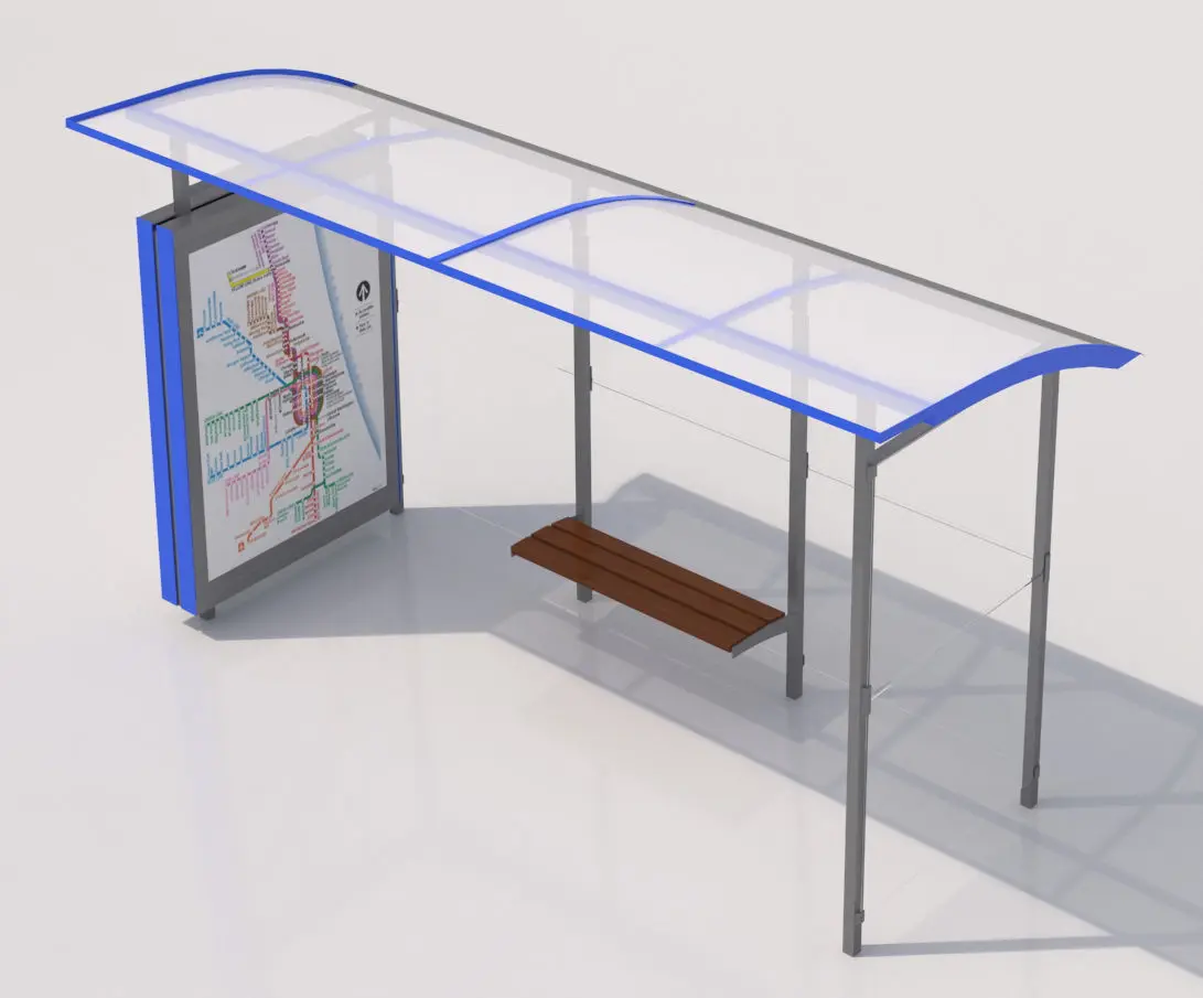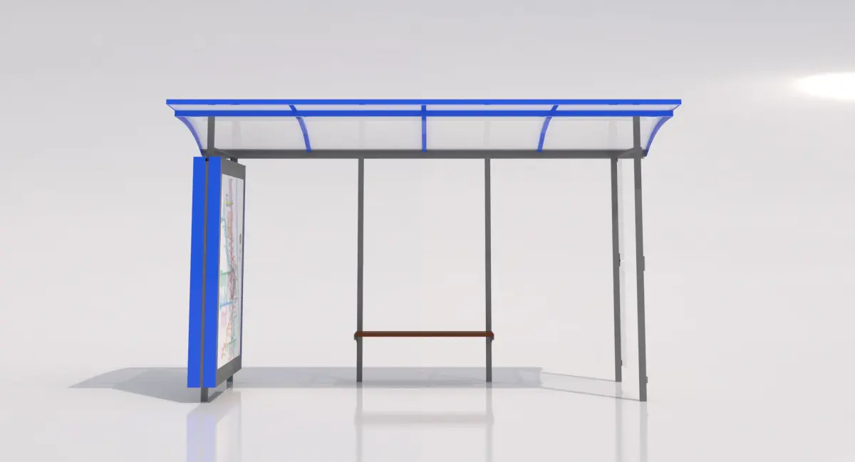 Made of: Steel structure, tempered glass, Angled Glass Roof, glass panels on rear and side with billboard on other side.