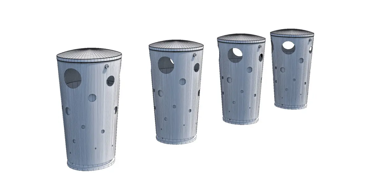 Metal bin with holes in it, also has interior bin -comes with all 4 colors shown, each bin has 15,921 polygonsTotal File: 63,684 Polygons, & 73,516 Vertices