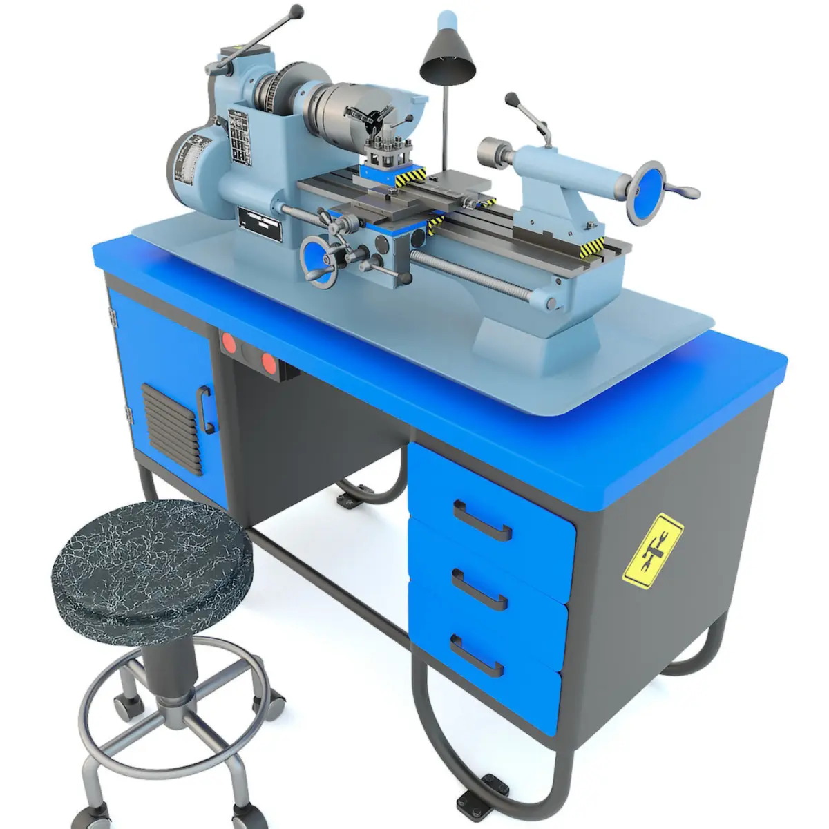 3d model: The MN-80A desktop lathe was worked out in a very detailed way during the creation process. Even the smallest elements of the machine are implemented on the model to give it even more realism and presentation moments. The machine model was perfectly suited for a wide variety of industrial projects and not only, because it can also be used in exterior visualization, in a garage, workshop, as well as other projects requiring original solutions related to industrial design. When creating this very detailed and realistic model of a lathe, the basic dimensions of the nodes and overall parameters of the machine were observed, which in general seems to be a convenient factor for placing equipment in a particular scene. In addition, elements such as the original workbench on which this machine is located and, of course, an industrial chair have been recreated, which positions three models in one.Tables, nameplates and stickers are applied on the machine for an even more interesting presentation of equipment. In addition, the type of painting used on the machine was mixed, which generally emphasizes the overall appearance of the model in an even more detailed presentation. At the same time, the model is configured in such a way that, if desired, the materials applied to it can be changed quite easily, which also characterizes it as the most versatile. However, the presence of certain industrial textures displays an even more interesting feed. At the same time, due to its very small real dimensions, the machine can be used to work both in large industrial production workshops, but also in the smallest rooms, which in general will necessarily emphasize its versatility.