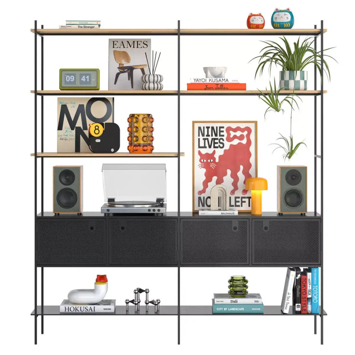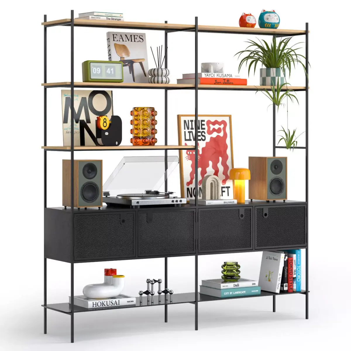 MOBA shelving with mid-century decor and vinyl player.