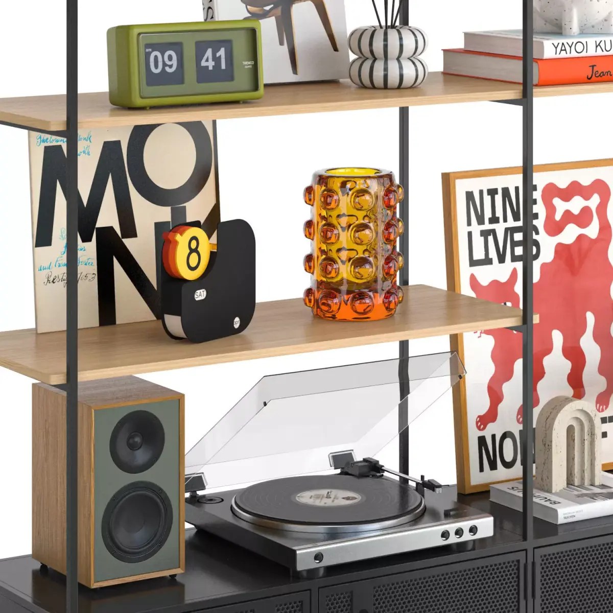 Decor: Audio Technica vinyl player, speakers, Bellhop lamp, Artemide vase, books, records, clock, poster, candle holder, vases, houseplant.To turn on the yellow lamp, place the Vray or Corona light in the center of the lampshade.