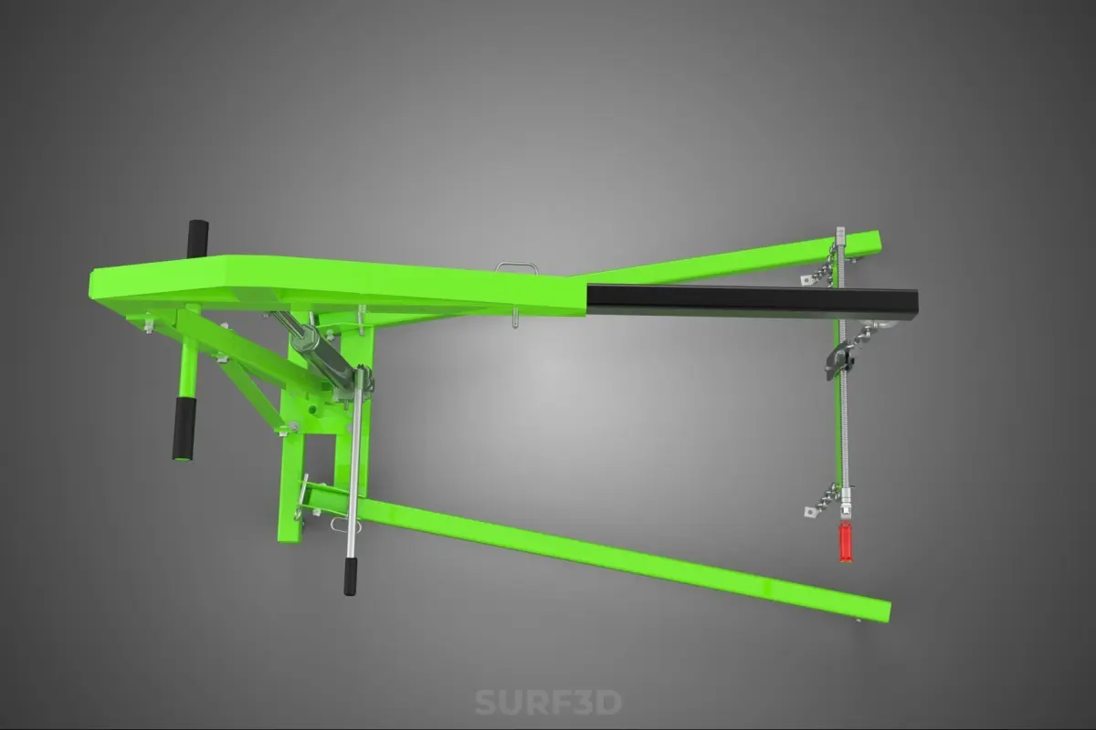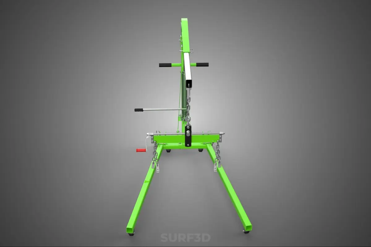 Functionally, the device utilizes mechanical advantage to lift loads that would be impossible or unsafe for manual handling. It typically comprises a sturdy frame or chassis mounted on wheels or casters, allowing it to be moved into position around a vehicle or workpiece. Extending from the base is an upright column supporting a horizontal or angled boom (or jib) that can often be extended or adjusted in height. The hoisting mechanism, usually a hydraulic cylinder operated by a manual pump lever, is mounted on the boom or column and connects via a chain, cable, or hook to the load. This setup allows vertical lifting and, due to the mobile base, limited horizontal movement of the suspended load.