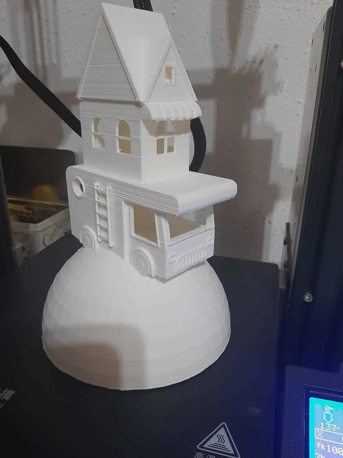 This is a design of a caravan with a house on top for those who like to travel by car. The caravan is attached to a round base.It is printed with brackets on the bottom base of the caravan and on the top window of the house.
