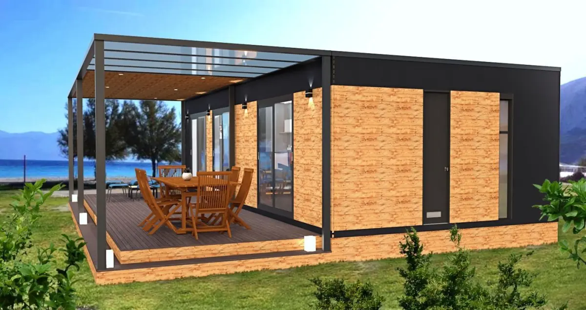 Modern , completely finished ,fully furnished mobile home/vacation house/tiny house with terrace.Modern designed mobile house on 40 m2 with terrace.,2 bedrooms, 2 toilet/shower, kitchen /living room...Unique designed,highly detailed model with lot of useful 3D models and furniture in it and lounge on terrace..Model contains house with all the furniture in ,living room,kitchen ,2 bedroom,2 bathroom and terrace.Different facade variables are possible ,from stone,PVC or wood planks.Also feature a custom design tv set and kitchen table and chairs .. and paintings from my friend.On the back front of the mobile house ,there is big and nice terrace .Kitchen is actually designed for a known customer and contains ,induction plate ,hood,sink,table ,chairs... Suitable for sea site area as for the mountain areas.Model is done with sketch up 2017 pro and rendered with v-ray 3.4. All textures appliances and furniture equipment is in high resolution,have been checked and are included in scene.Textures are compresed in zip file.Model is easy to manipulate and ready to render with v-ray.Real world scale and exact proportions cm. Realistic and correctly scaled !• Excellent polygon & texture efficiencyPurchasing this model , you get files in different formats as :skp, or ask designer for different formats.Additional Textures provided with the model:
