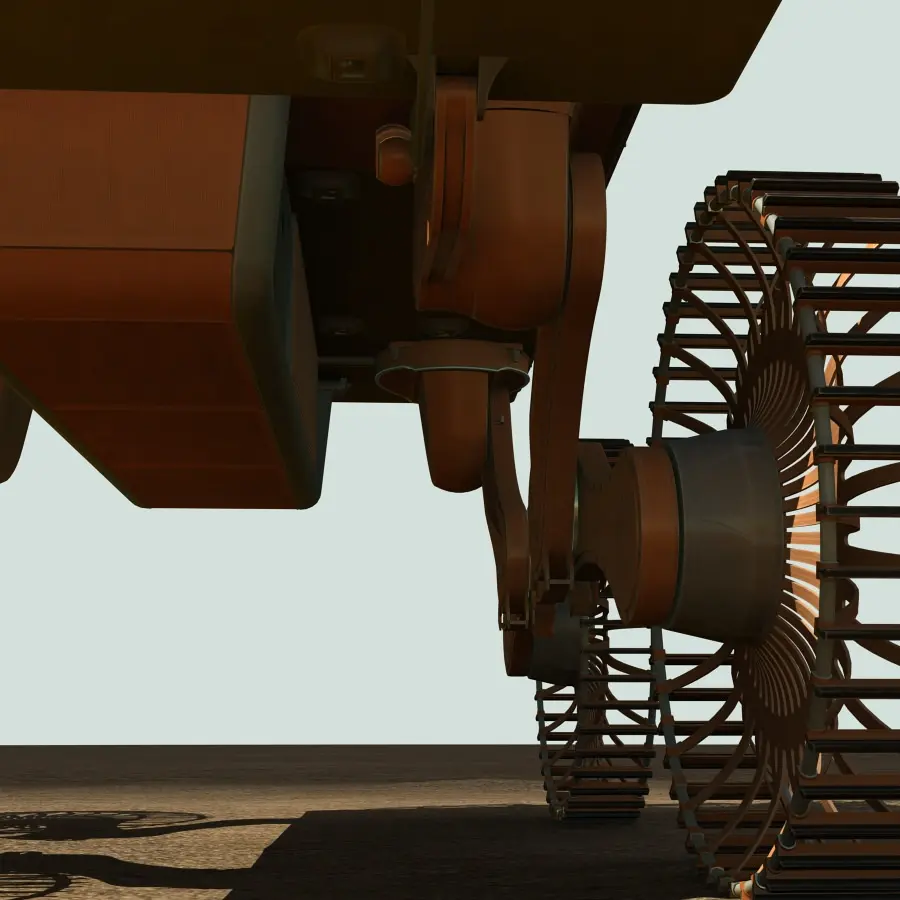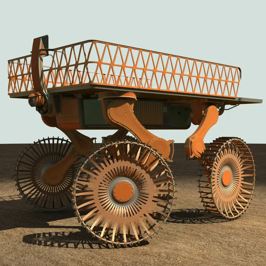 The mobile platform is a lightweight electric loader with variable clearance, realtime terrain adaptation AI both by day and night, chamber-free wheels, a rear lifter and excellent cross-country capability. Fixation points for loads available both above and under the platform.