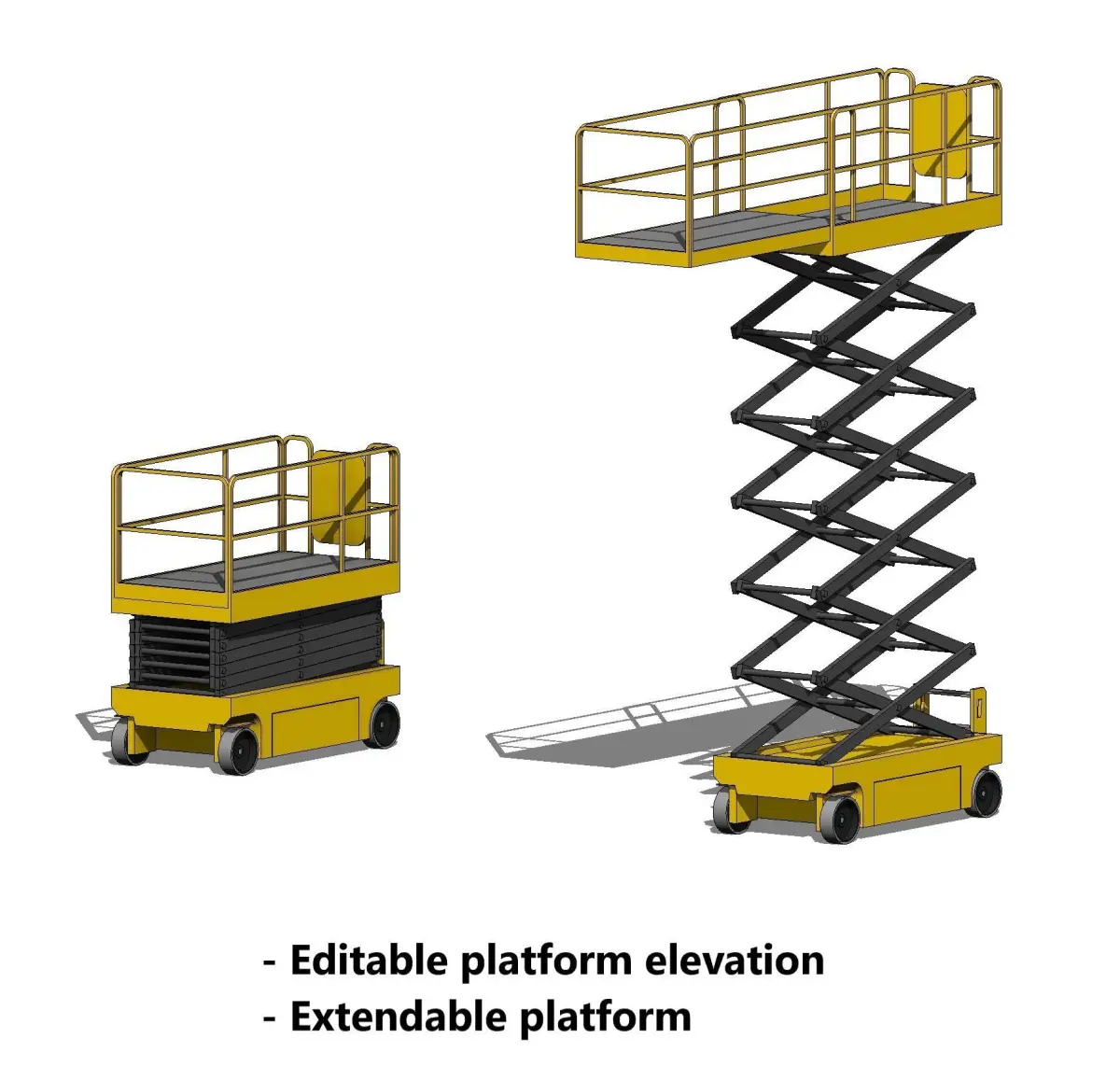 Self-propelled extendable scissor lift platform parametric Revit family. For Revit 2021 and above.Available file formats: RFA, MAX, DWG, FBX, 3DS, OBJ.