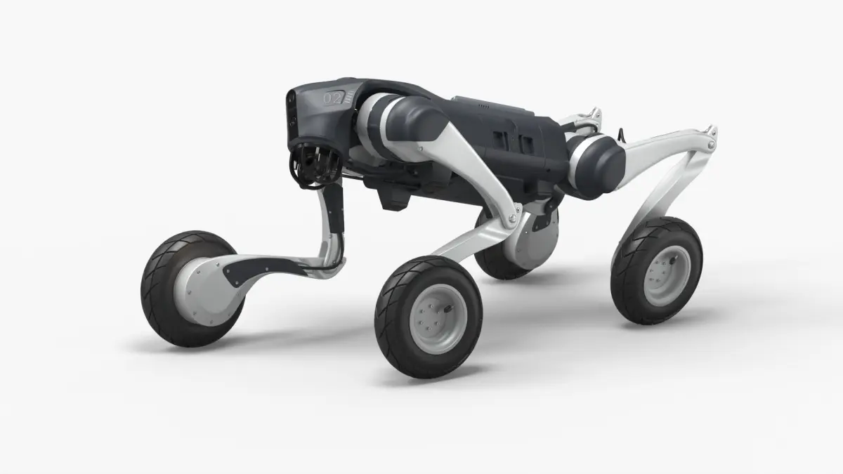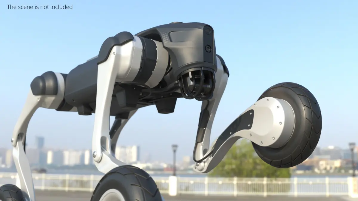 This model features a robust quadrupedal design with wheels on each leg, allowing it to traverse rough terrains efficiently. The robot includes advanced components that facilitate smooth movement and obstacle negotiation. Its modular structure supports the integration of additional sensors and tools, making it suitable for diverse applications.