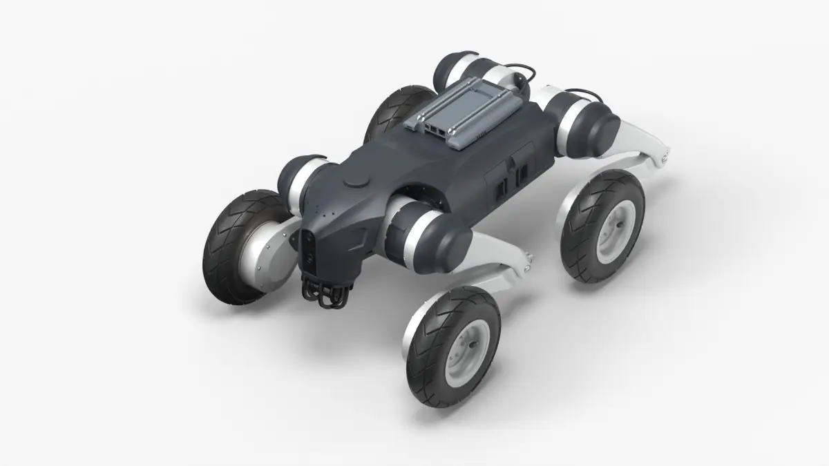 This model features a robust quadrupedal design with wheels on each leg, allowing it to traverse rough terrains efficiently. The robot includes advanced components that facilitate smooth movement and obstacle negotiation. Its modular structure supports the integration of additional sensors and tools, making it suitable for diverse applications.