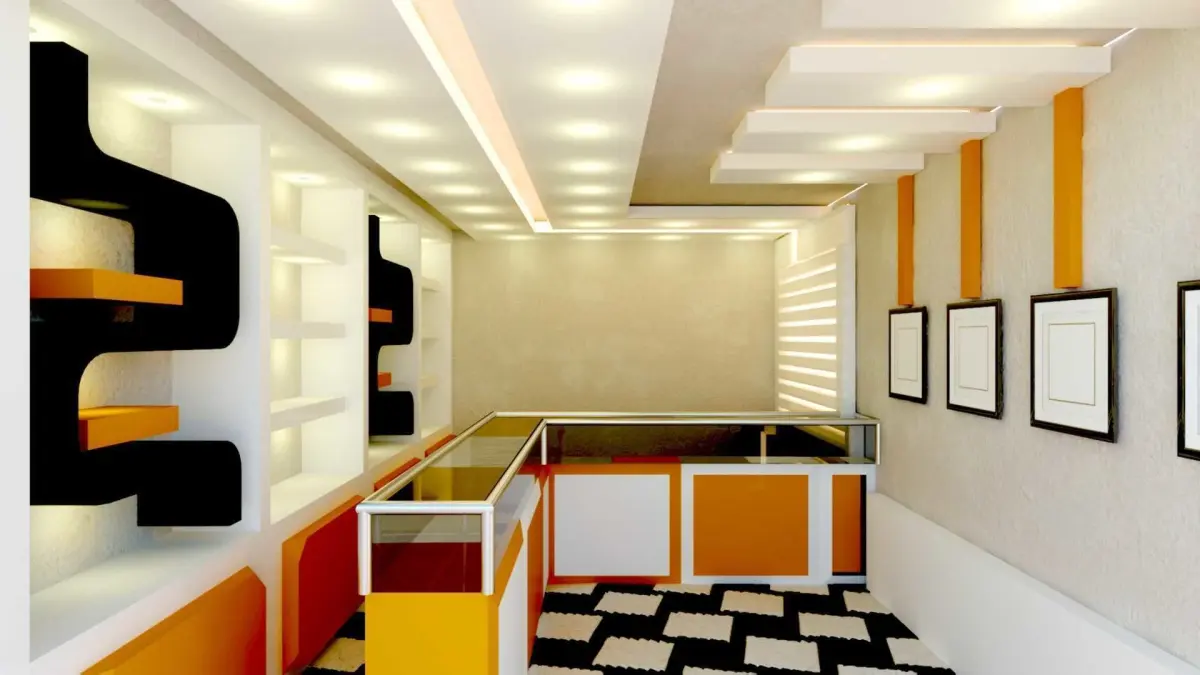 interior design for a mobile shop . this design depend on celling decor using neon light , spot light (Linear decoration to make the shop appear bigger and taller) lenght : 6width : 3.5 hight : 3