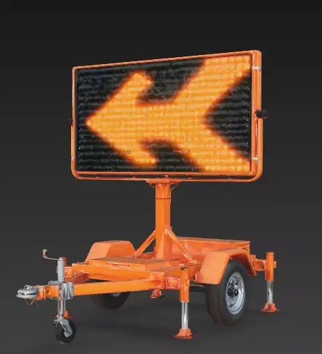 Bright LED Arrow Display The most important feature is the large rectangular board covered in small amber lights. In the image, these lights are turned on to form a bright Left Arrow shape, clearly telling drivers to merge into the next lane.