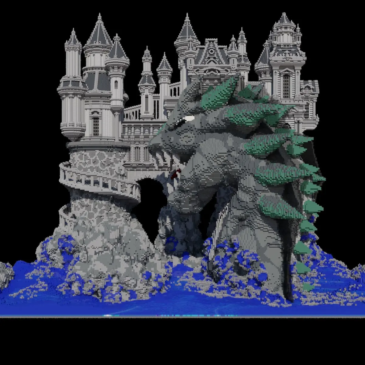 Model of a castle with a dragonA model of a castle with a dragon in low poly. Similar to minecraft.Epic castle with a huge dragon that sits at one of the towers. The castle itself is located on sharp rocks, and the dragon statue perfectly complements this view