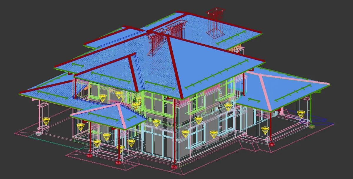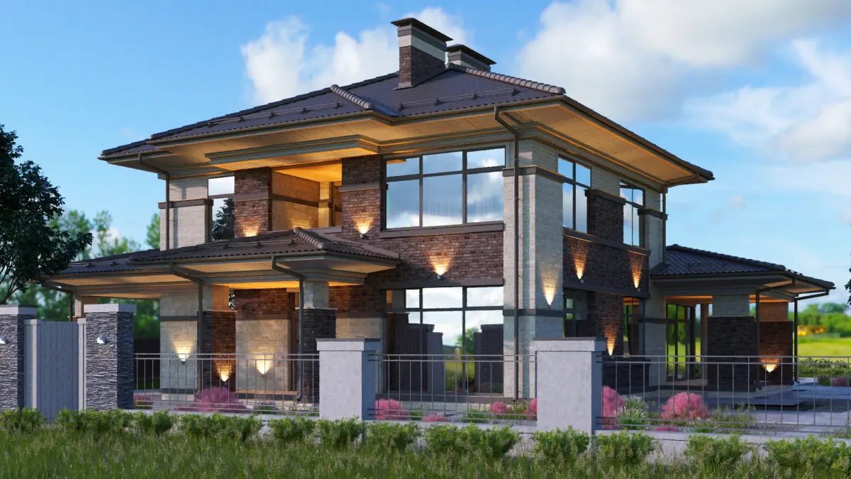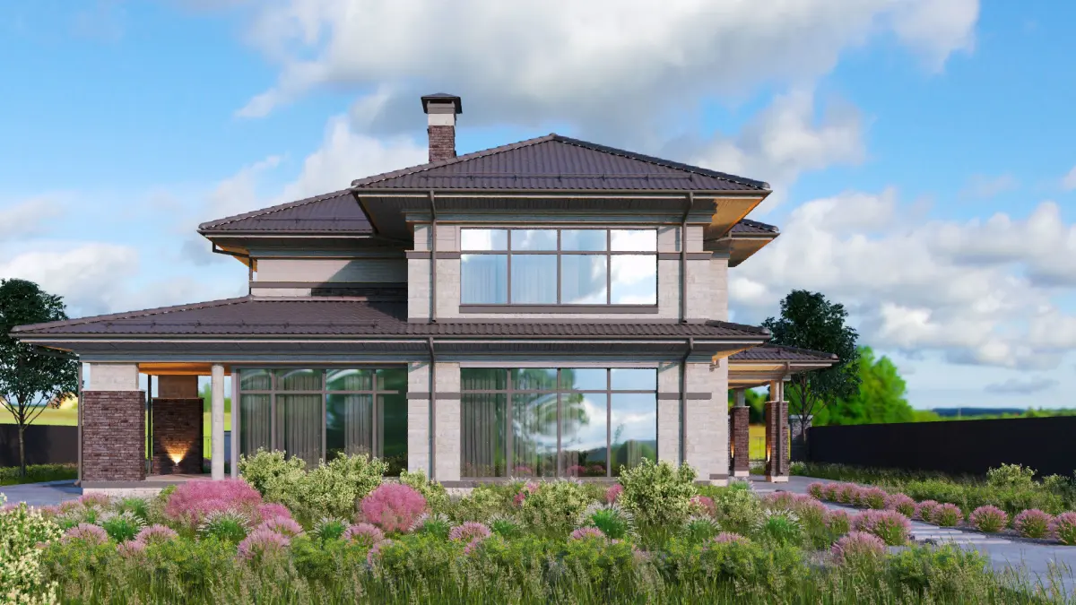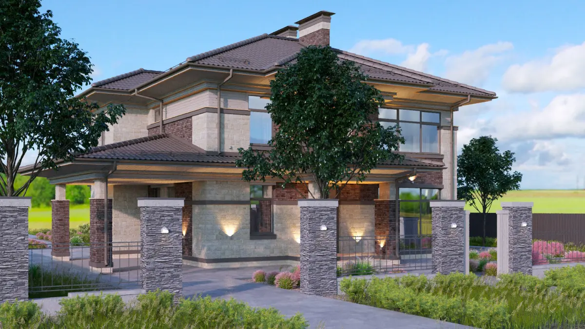 The house is made in bold colors and with panoramic windows. The roof is made of tiles of complex shape. None of the style of the house can be compared to the Staley Wright. This house will fit in any landscape and natural environment. The stone structure will serve for many years. The house has high ceilings. The arrangement of furniture is thought out taking into account the geometry and location of windows. On the balcony it is good to breathe fresh air. For more information and an overview of the house, follow the link - https://zen.yandex.ru/media/id/5daf543b118d7f00c3033eca/poroi-hvatit-i-navesa-vmesto-garaja-v-dome-220-m2-v-stile-raita-5f41100a0004036496196bbc