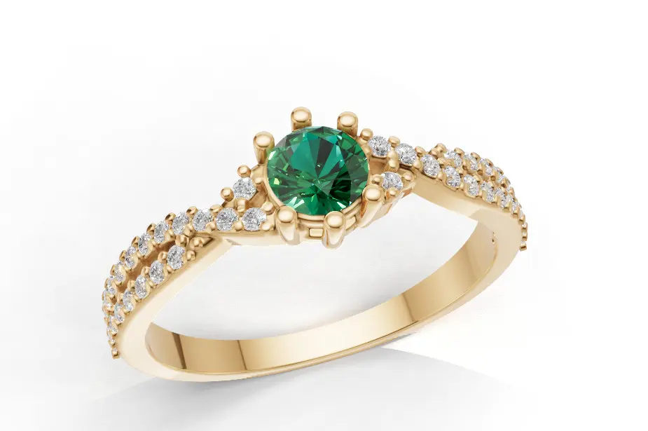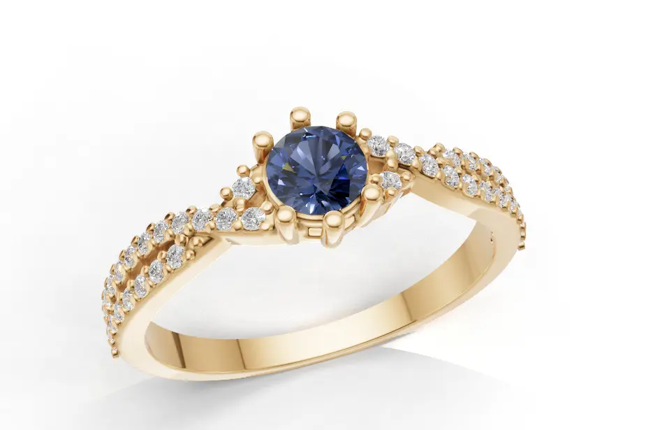 Modelo 3D de anel solitário clássico, com aro duplo cravejado e pedra central. A peça conta com 1 pedra central de 4mm e 44 pedras laterais de 1mm, proporcionando um visual sofisticado, moderno e atemporal. Ideal para uso como anel de noivado, compromisso ou presente especial.
