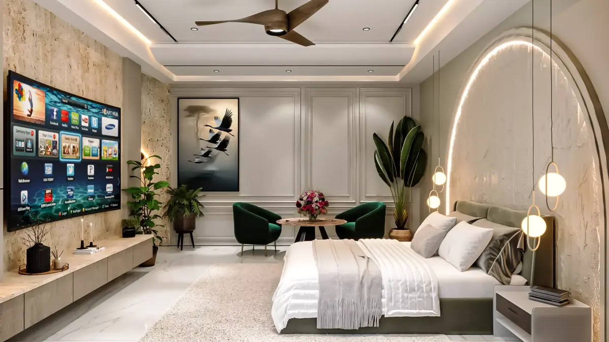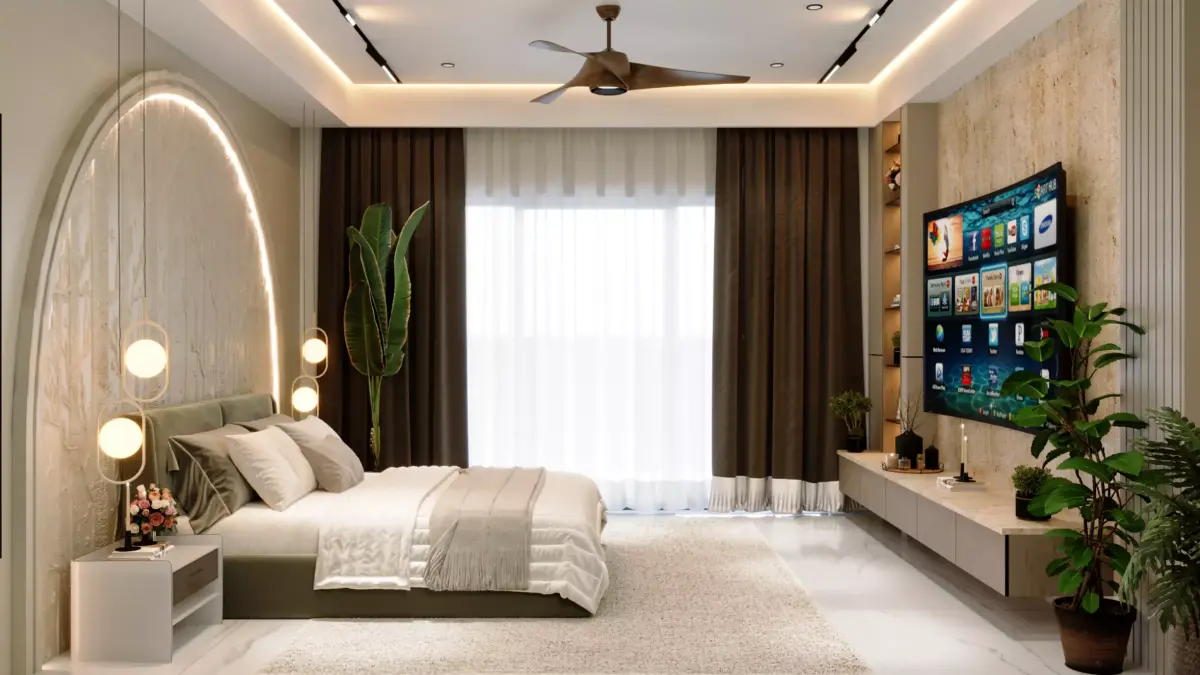 A modern luxury bedroom with a neutral color palette, featuring a central upholstered bed highlighted by an arched LED-lit accent wall. Warm lighting, sleek ceiling design, soft furnishings, indoor plants, and a cozy seating corner create a calm, elegant, and comfortable atmosphere.