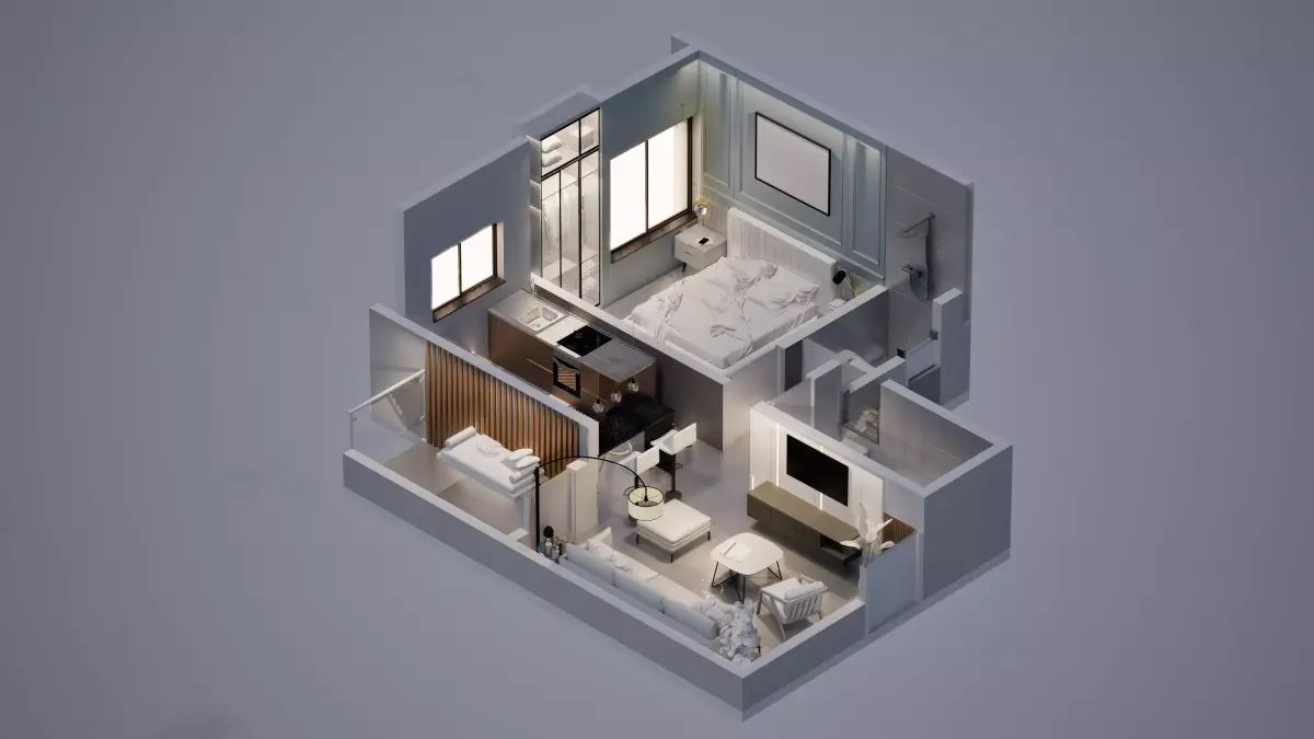Modern 1BHK Flat Interior – Isometric View with Contemporary Furniture | Low-Poly 3D Model