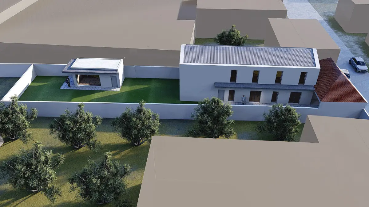 This is a clean and modern 2-story house design with a 23x6 meter building footprint placed on a 46x10 meter site. The model is optimized for concept visualization, architectural proposals, or real estate marketing.