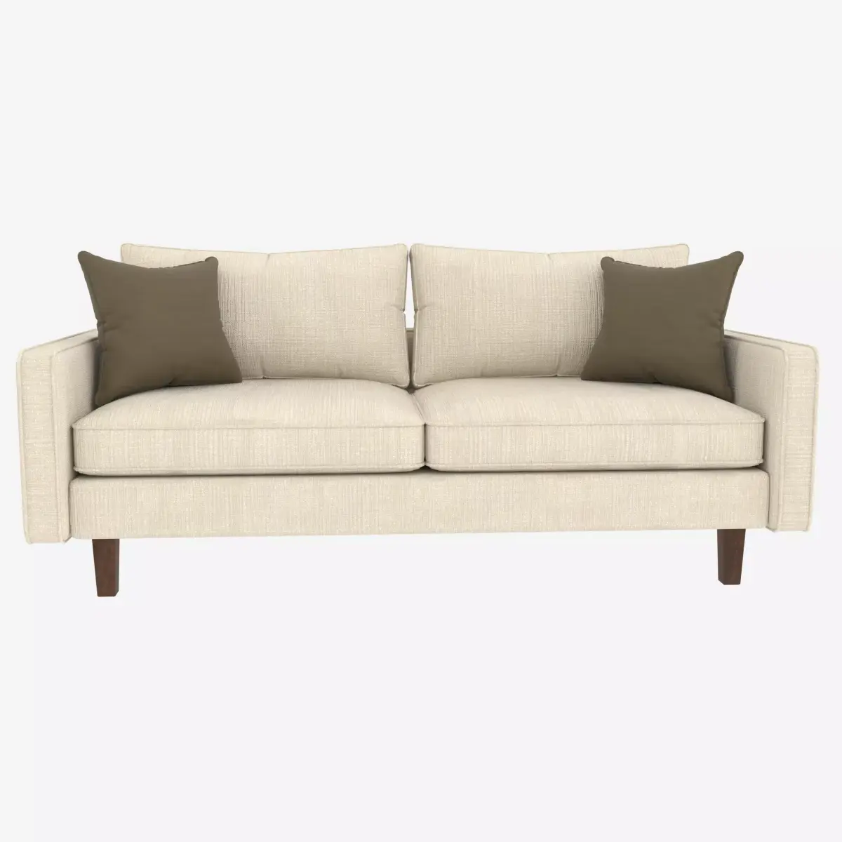 The model is available in several color variations: a dark gray fabric version for a sleek, modern look, and a light beige version with darker accent pillows for a warmer, cozier atmosphere. The fabric material is a tightly woven, matte textile that resembles linen or cotton, giving the sofa a natural, soft finish. The legs are short, tapered, and made of dark wood, adding a touch of Scandinavian design influence.