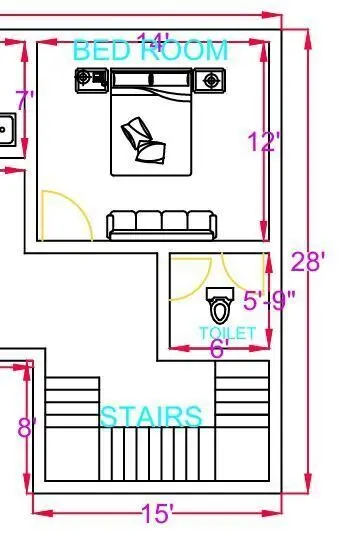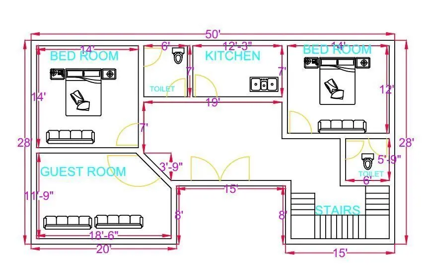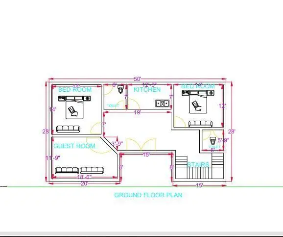 This is a professionally designed 2BHK ground floor house plan, created using AutoCAD, ideal for residential construction, architectural presentations, and planning purposes. The layout is designed for a 50 feet by 28 feet plot, offering approximately 1400 square feet of built-up area, with intelligent space management and a practical, comfortable layout.