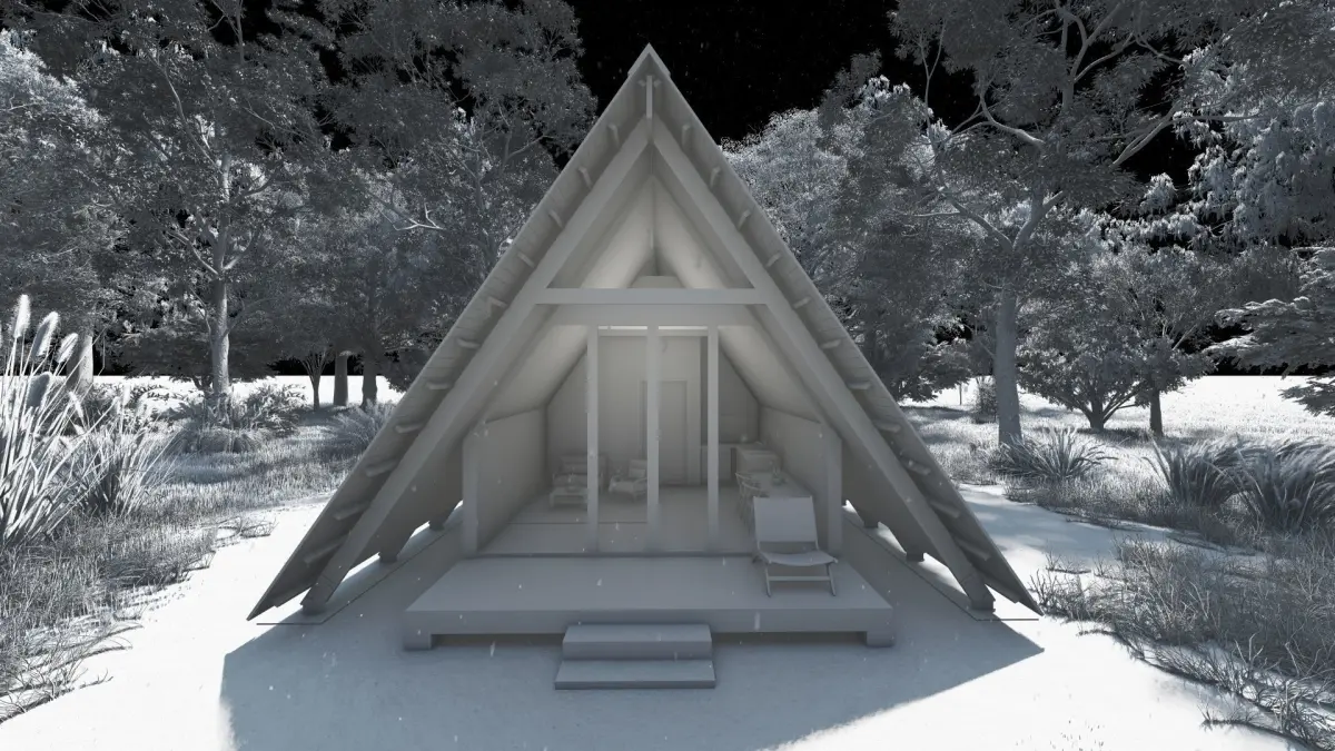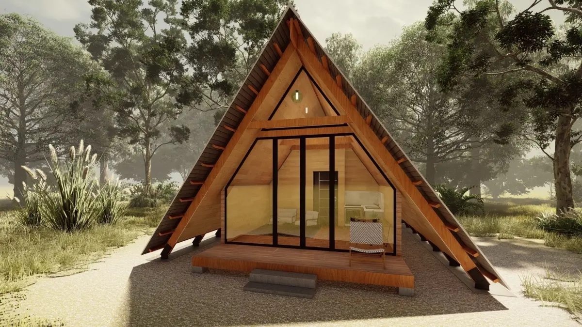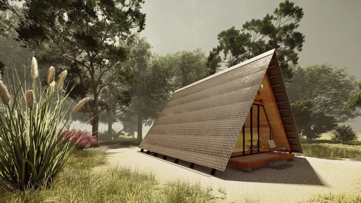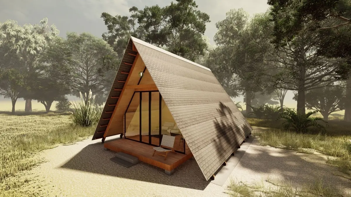 Thids is a Beautiful Modern A- Frame Cabin House 3D, Design by Experiance Architectural 3D vizualizer.This A-Frame cabin has Living & Pantry Area, 1 Bed Room, 1 bathroom & Deck.This cabin Design combine Traditional & Modern Living space. We Hope you Enjoy this Modern A-Frame cabin House 3D.