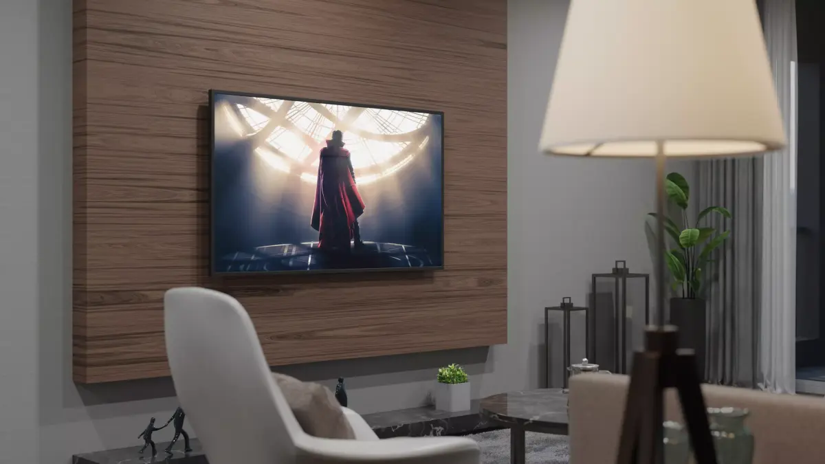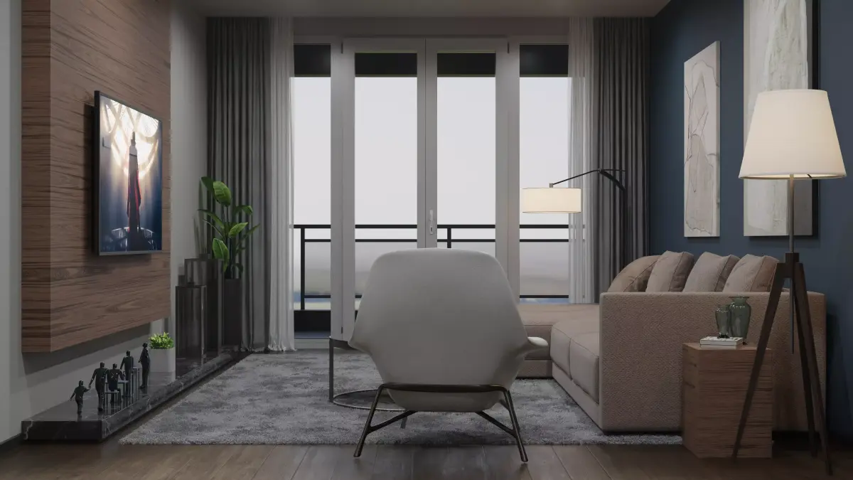 This modern living room is a masterclass in contemporary minimalism, blending warm organic textures with a sophisticated, moody color palette. The space is anchored by a deep navy-blue accent wall that provides a dramatic backdrop for the seating area, contrasting beautifully with the light grey armchair and the plush, sandy-toned sectional sofa. To the left, a large floor-to-ceiling wooden panel serves as a striking focal point, housing a sleek wall-mounted television. This vertical wood grain adds a touch of natural warmth, balancing the cooler tones of the grey shag rug and the dark marble plinth running along the base of the wall.Light plays a crucial role in this design. The room is flooded with soft, natural light coming through expansive glass doors that lead to a private balcony, offering a seamless connection to the outdoors. For evening ambiance, the space features diverse lighting layers: a modern, arcing floor lamp leans over the sofa, while a classic tripod lamp with a cream shade provides a cozy glow in the corner.The decor is curated and intentional. Small sculptural figures and minimalist planters sit atop the marble ledge, while abstract line art on the blue wall adds a gallery-like feel. A lush green indoor plant tucked in the corner breathes life into the composition. The furniture—characterized by clean lines and low profiles—creates an unobstructed flow, making the room feel both spacious and intimate. This interior is a perfect example of refined urban living, where comfort meets high-end architectural design.