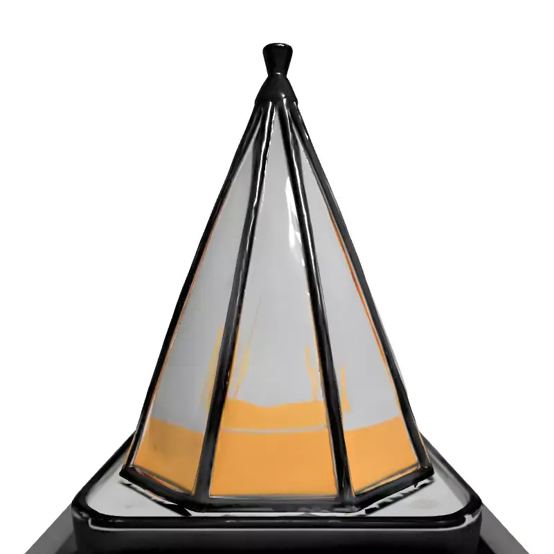 This exquisitely designed 3D model presents a modern and futuristic desk or table lamp, characterized by its distinctive pyramidal structure. The sophisticated design features a transparent outer shell, likely made of glass or acrylic, elegantly encasing an internally glowing, vibrant orange pyramid. This central luminous element is supported by a sleek metallic frame, all resting on a minimalist rectangular base. The model is perfect for elevating contemporary interior visualization projects, adding a unique touch to architectural renders, or enriching modern office and living room scenes. Its striking aesthetic also makes it an excellent asset for sci-fi game environments, virtual reality (VR) applications, and augmented reality (AR) experiences, providing immersive visual appeal. Furthermore, it serves as an intriguing focal point in digital art compositions and cinematic renders, enhancing any digital scene with its unique charm. The model boasts clean geometry and an optimized polygon count, ensuring efficient performance across various platforms. It is meticulously UV unwrapped, allowing for easy application of high-quality PBR textures for realistic material representation. This asset is provided in multiple industry-standard formats, including GLB, FBX, OBJ, USD, DAE, ABC, and PLY, facilitating seamless integration into any 3D workflow. Whether for real-time engines or high-fidelity static renders, this lamp offers exceptional versatility and visual appeal, ready to illuminate your projects.