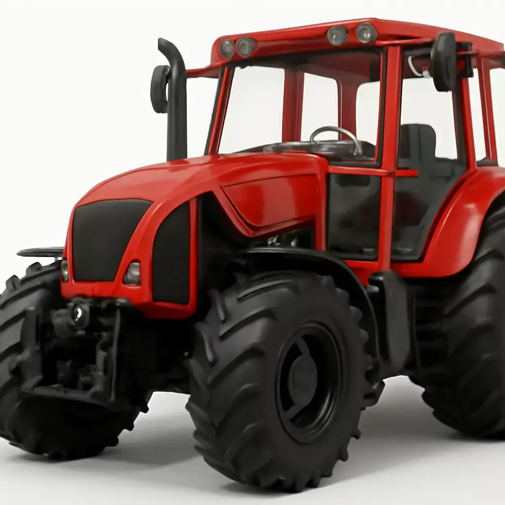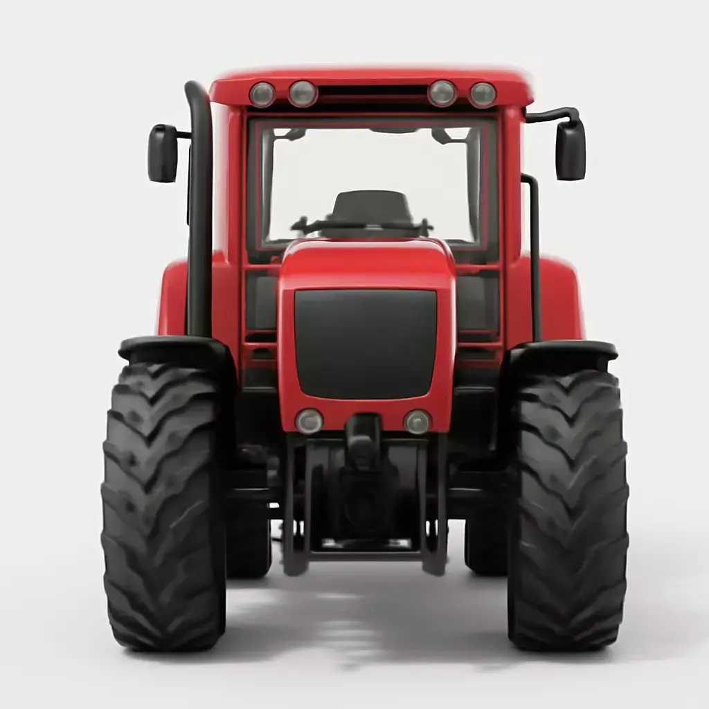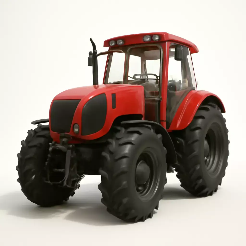 This 3D model depicts a modern agricultural tractor, showcased in a vibrant red finish with a focus on functional design and mechanical detail. The rendering highlights a fully enclosed glass operator cabin, providing 360-degree visibility, and is topped with an integrated lighting array for nighttime operations. The vehicle's powerful stance is anchored by large, high-traction pneumatic tires with deep treads, designed for heavy-duty field work and stability across varied terrain. Technical features such as the front-mounted hitch assembly, vertical exhaust stack, and streamlined hood cooling vents are meticulously represented, emphasizing the model's industrial utility. Presented against a minimalist white background, the model exhibits clean topology and realistic material shaders, making it a versatile asset for farming simulations, industrial visualizations, or educational content.