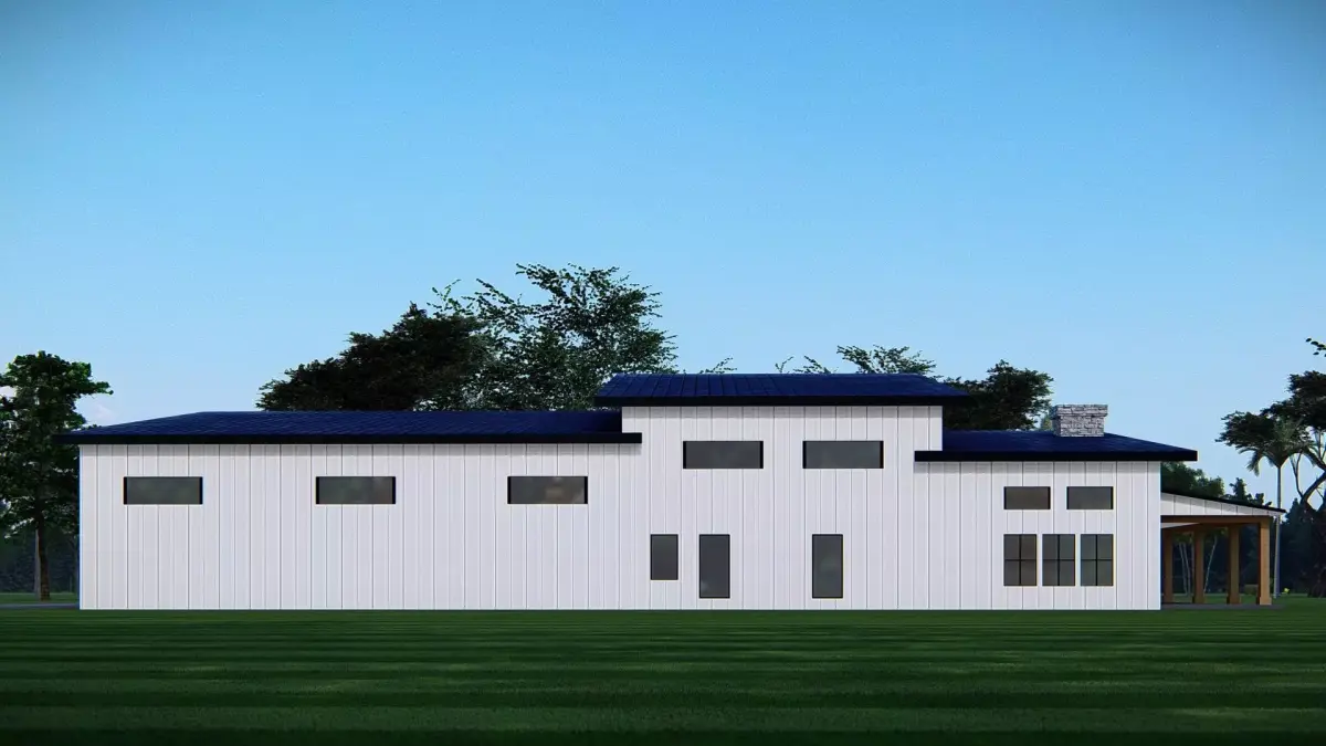 This Modern American Barndominium Farmhouse 3D Model is a detailed and realistic representation of a contemporary country home that blends the industrial appeal of a barndominium with the warmth of farmhouse design. Featuring vertical siding, expansive windows, a stone chimney, and a large multi-car garage, this design is ideal for those seeking both modern style and rustic comfort.