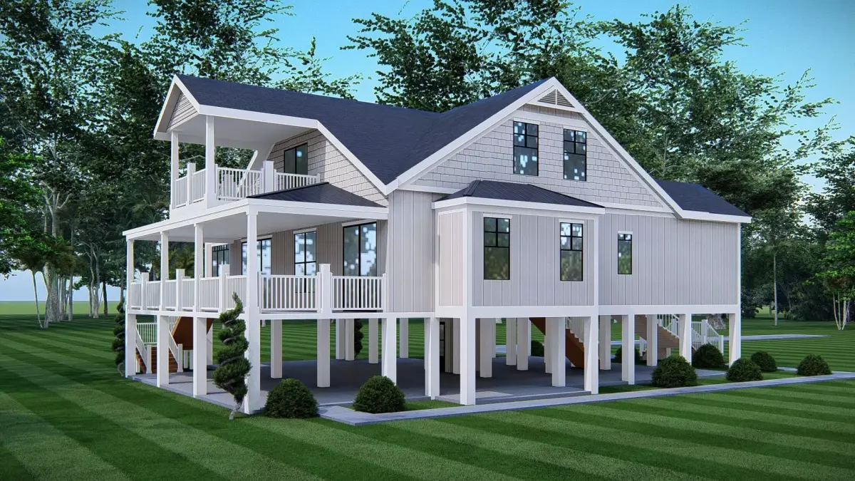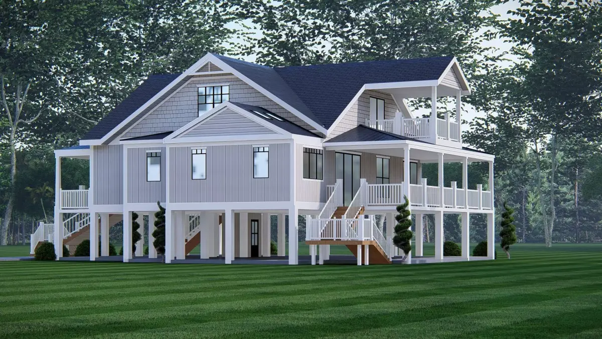 The exterior features clean siding, pitched gable roofs, wide balconies, wraparound porches, and elegant white railings, reflecting the authentic American country farmhouse aesthetic. The elevated design not only enhances durability but also provides additional open space beneath the house, which can be used for parking, storage, or outdoor recreation.
