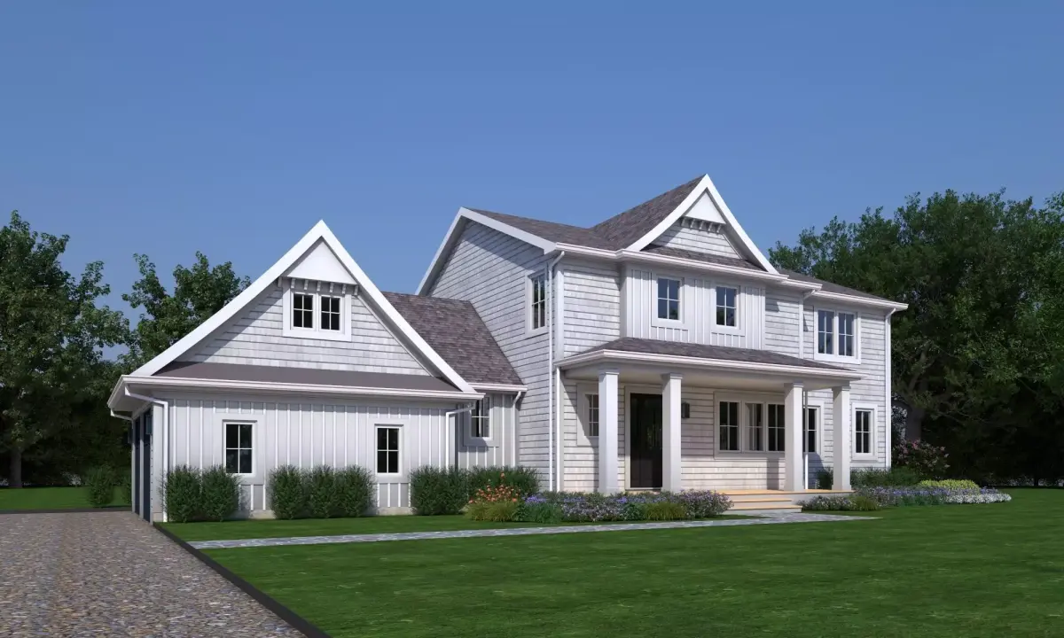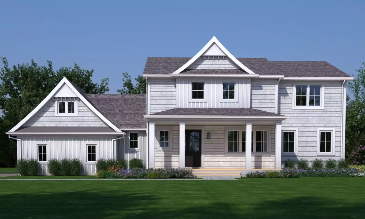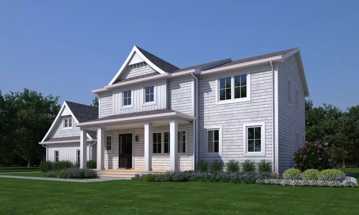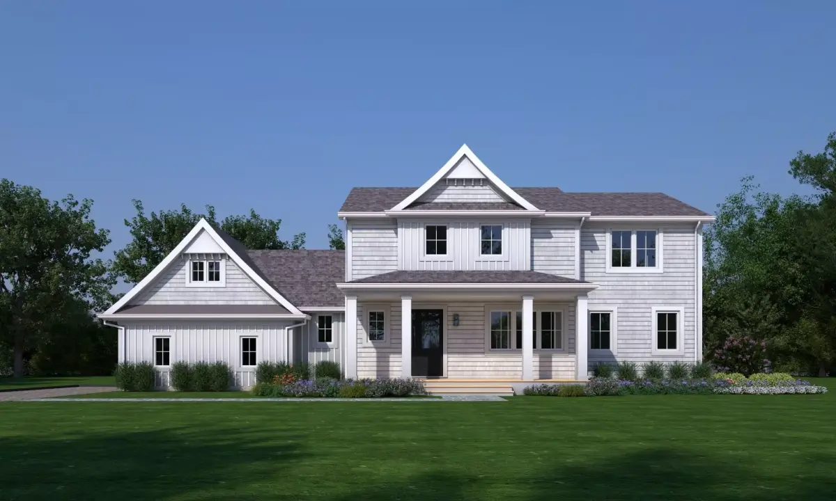 The model depicts a two-story detached house with a gable roof, a column-supported front porch, and a wing structure. The exterior design blends clean modern lines with classic farmhouse elements, making it suitable for suburban residential projects and country houses.