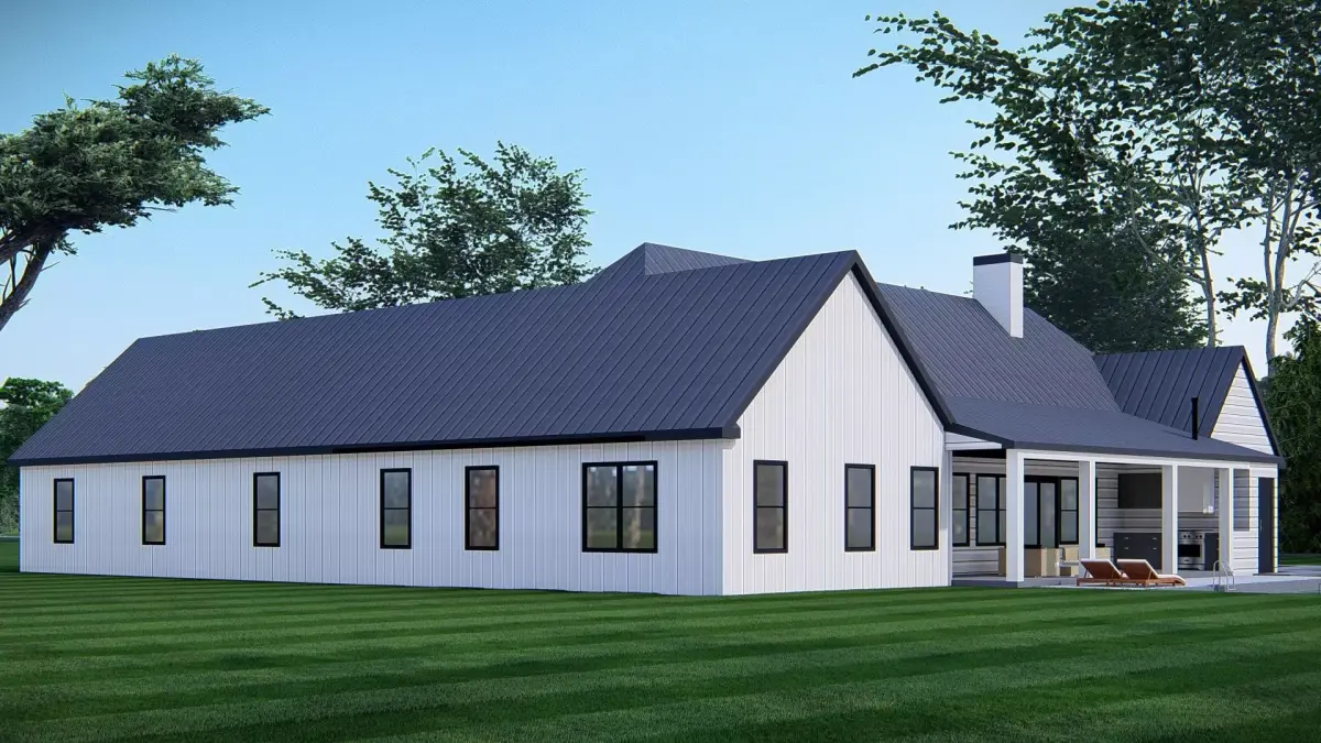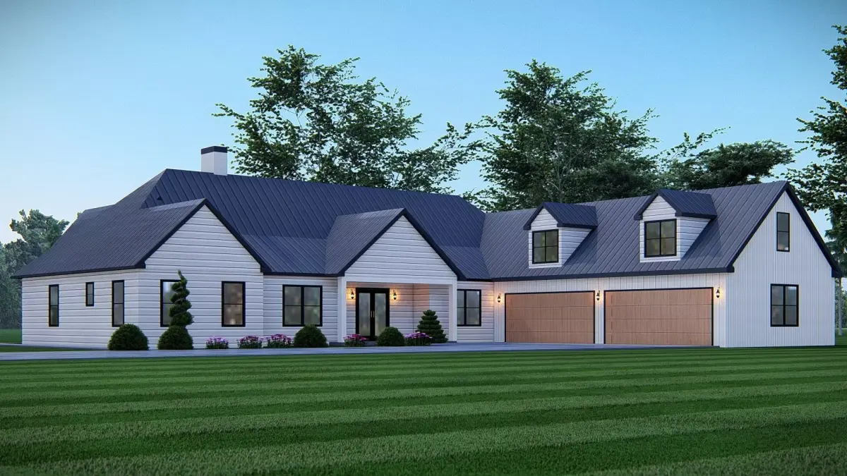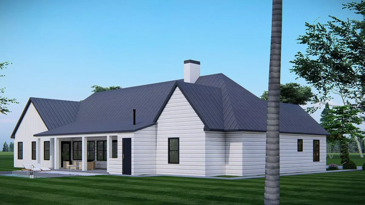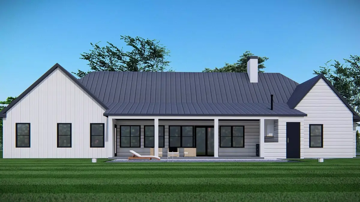 This modern American farmhouse 3D model showcases a beautifully detailed single-story home design, perfect for architectural visualization, rendering, and real estate presentations. The house features a sleek black metal roof paired with white horizontal siding, creating a clean and timeless American look. Large black-framed windows add a modern touch, allowing for natural light and enhancing the home’s visual appeal.