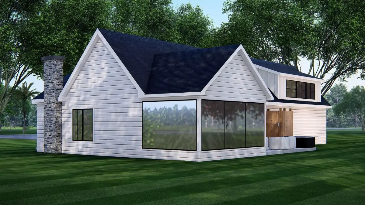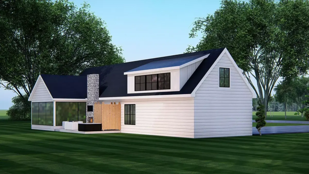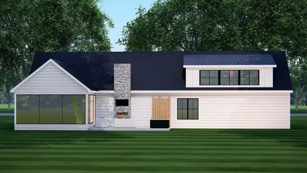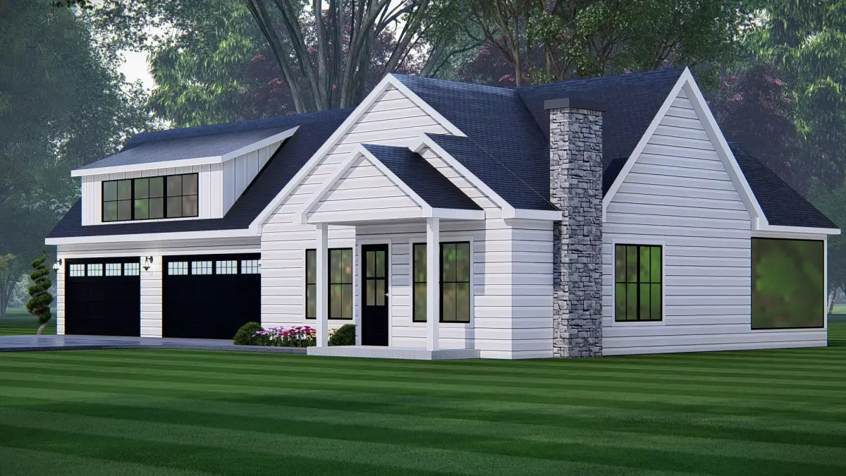 This Modern American Ranch Farmhouse 3D Model features a beautifully detailed single-story country home, blending traditional farmhouse warmth with modern design elements. The house includes a spacious attached garage, a welcoming front porch, large windows for natural light, and a rustic stone chimney that adds charm and character.