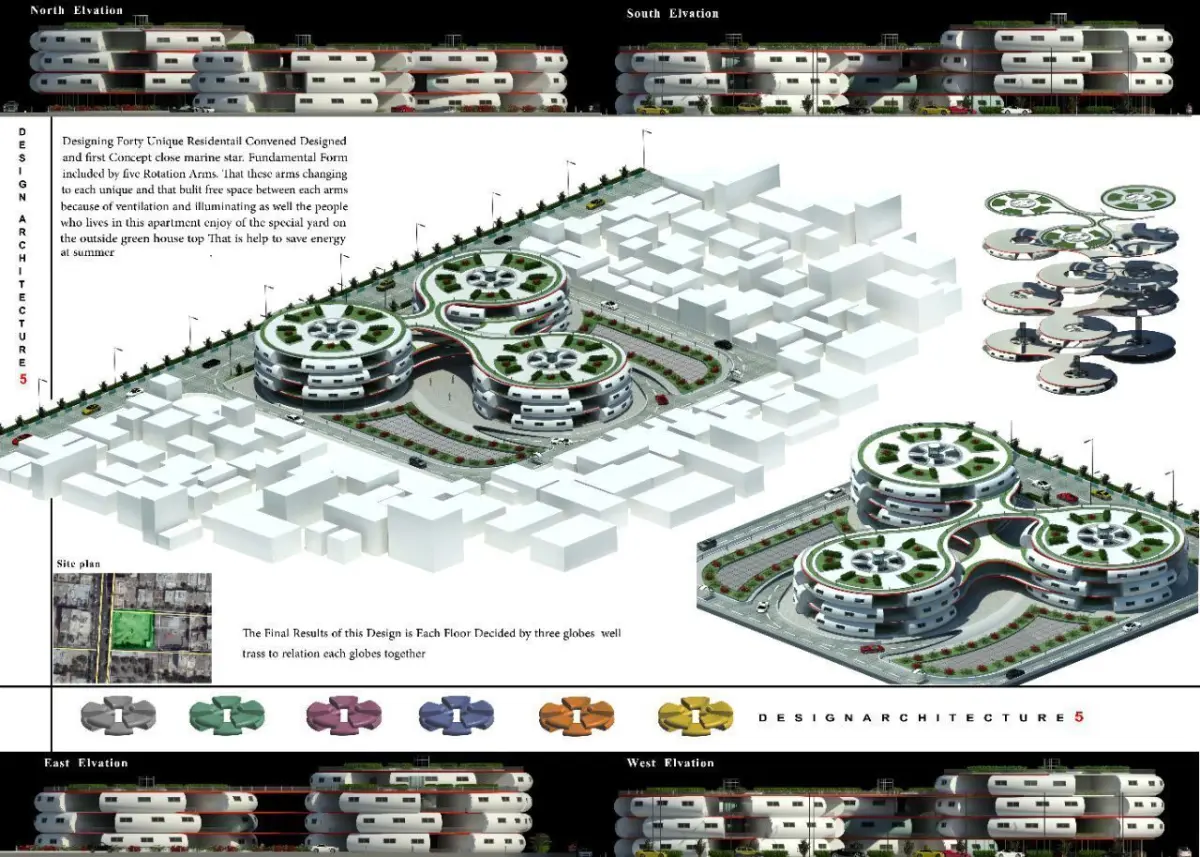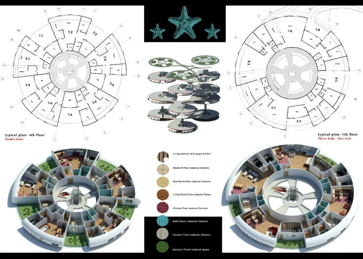 The project documentation includes Revit files with sheet layouts and a main project flow sheet, interior renders showing 3D sections of all units, six high-quality exterior renders produced using Revit and Enscape, site plan, floor plans for all levels, elevations, and perspectives. In addition to the Revit files, FBX files are also included, and all files are fully editable. This project is an ideal choice for students seeking a residential design project with guaranteed high grades or for thesis presentations.