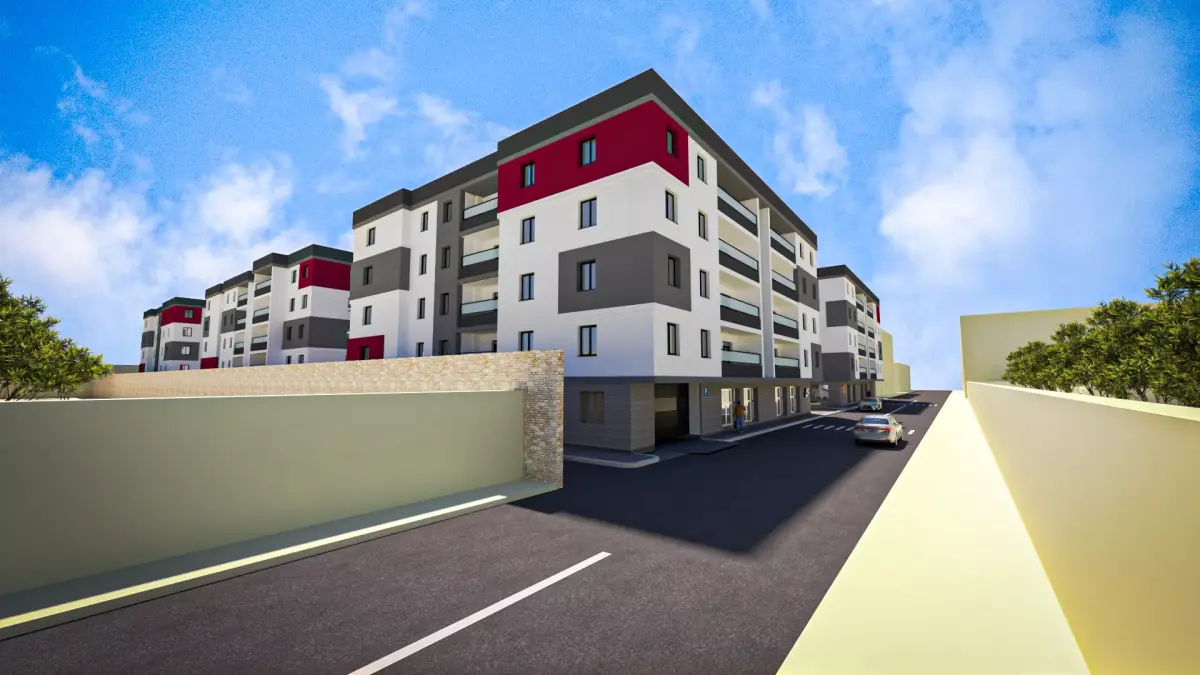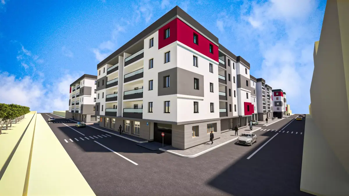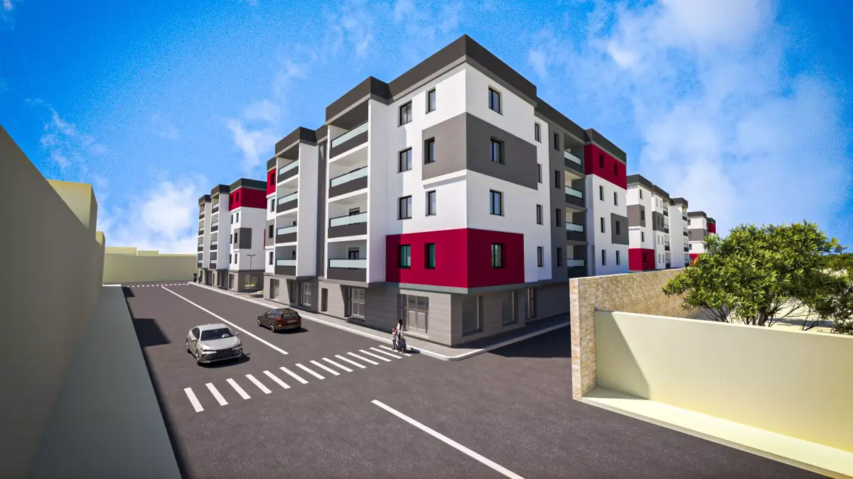 This is a highly detailed 3D model of a contemporary Residential Housing Complex featuring multiple mid-rise apartment blocks and a surrounding urban environment. The design showcases a modern architectural style characterized by a striking combination of white, grey, and vibrant magenta/red accents. Ideal for architectural visualization, urban planning, real-time engines, and scene backdrop creation.