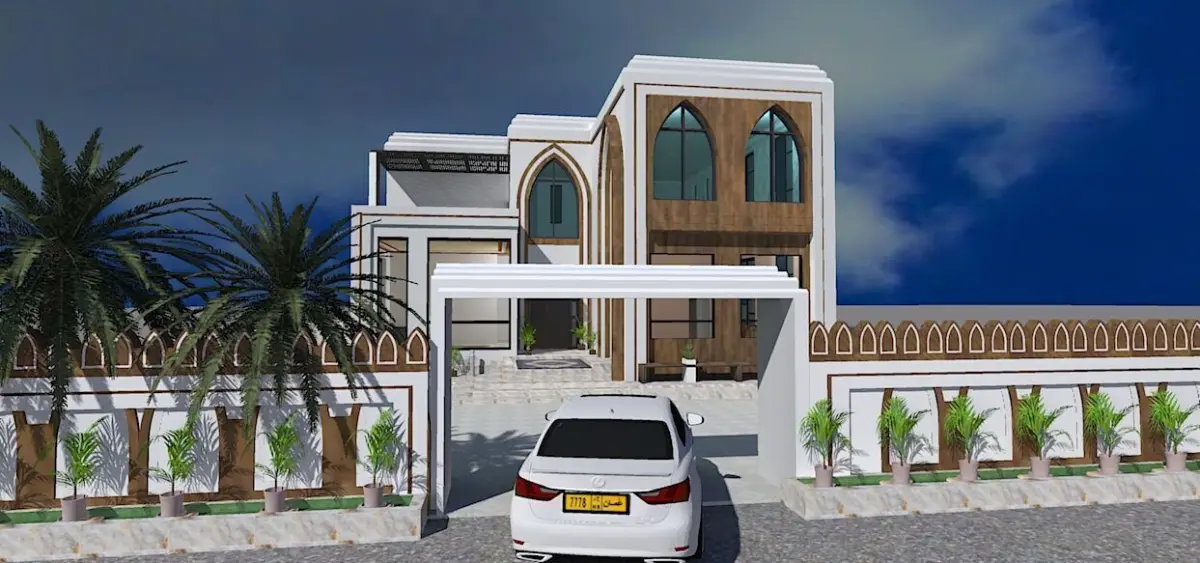 A detailed 3D model of a modern Arabic-style villa featuring arched windows, clean vertical lines, and a front garden layout. This project includes SketchUp files, DWG floor plans, and high-resolution renders from multiple angles. Perfect for architectural presentations or residential development proposals in Middle Eastern contexts.