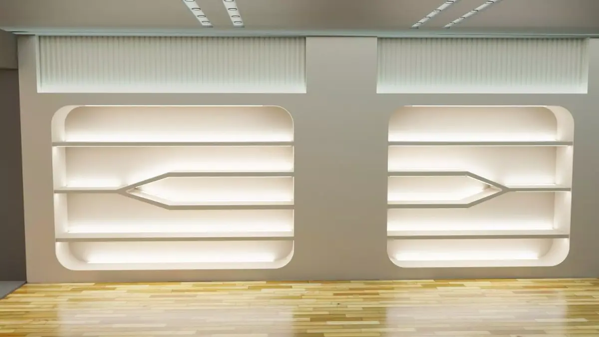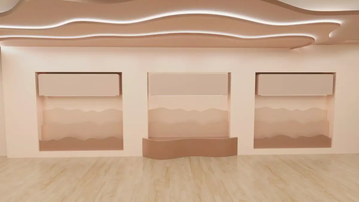 This high-quality 3D hall interior scene is designed with a perfect balance of modern aesthetics and architectural elegance. The model features beautifully crafted decorative wall panels, ambient LED lighting, and a premium contemporary layout that enhances realism and sophistication.