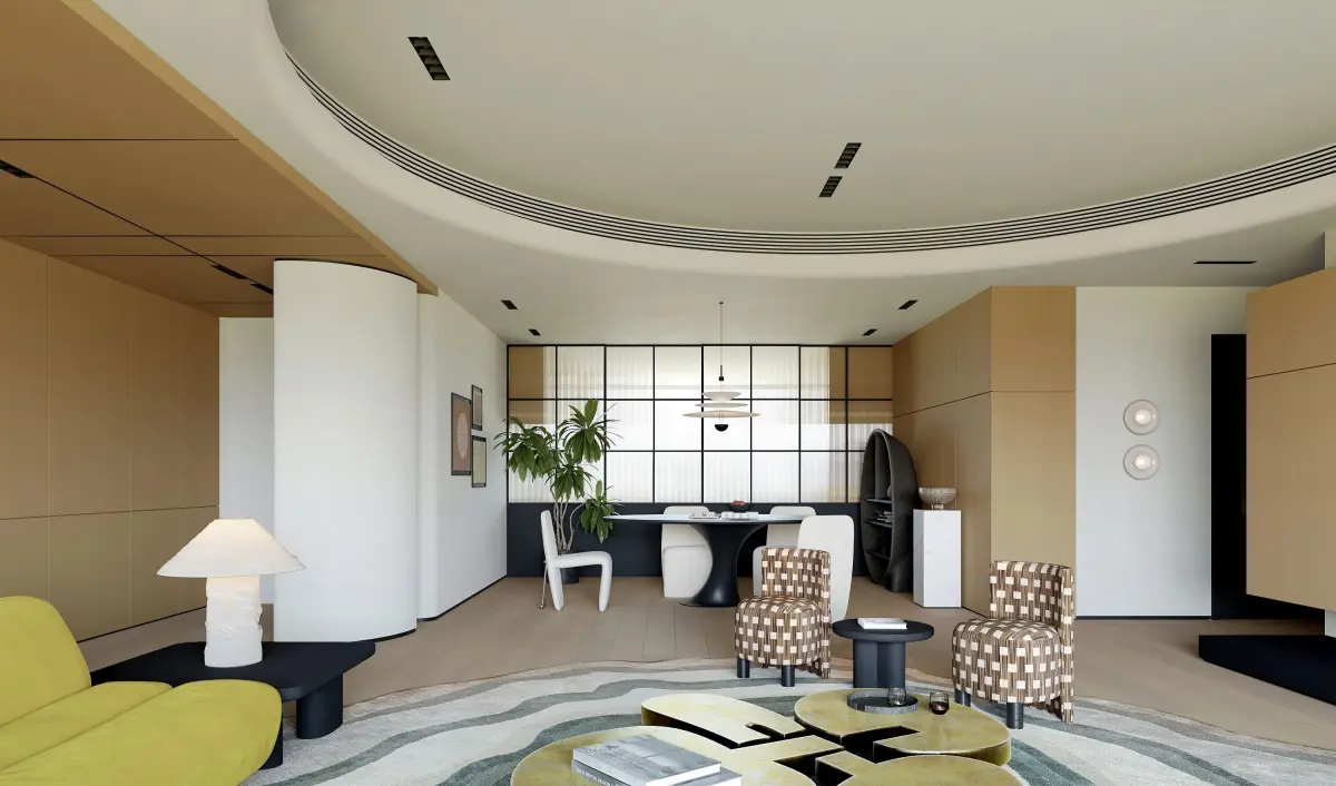 DescriptionA spacious and stylish living and dining area designed for a large modern apartment. This scene features bold design elements, personalized touches, and a harmonious blend of function and aesthetics. Perfect for those seeking a high-end, artistic layout with character and space.