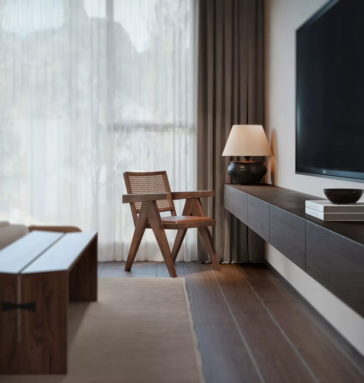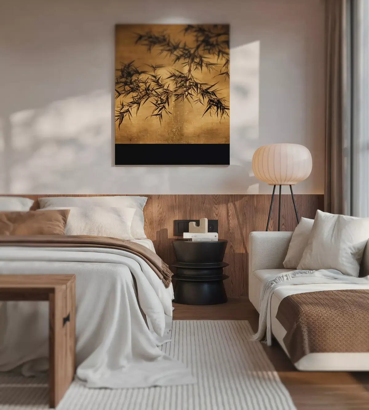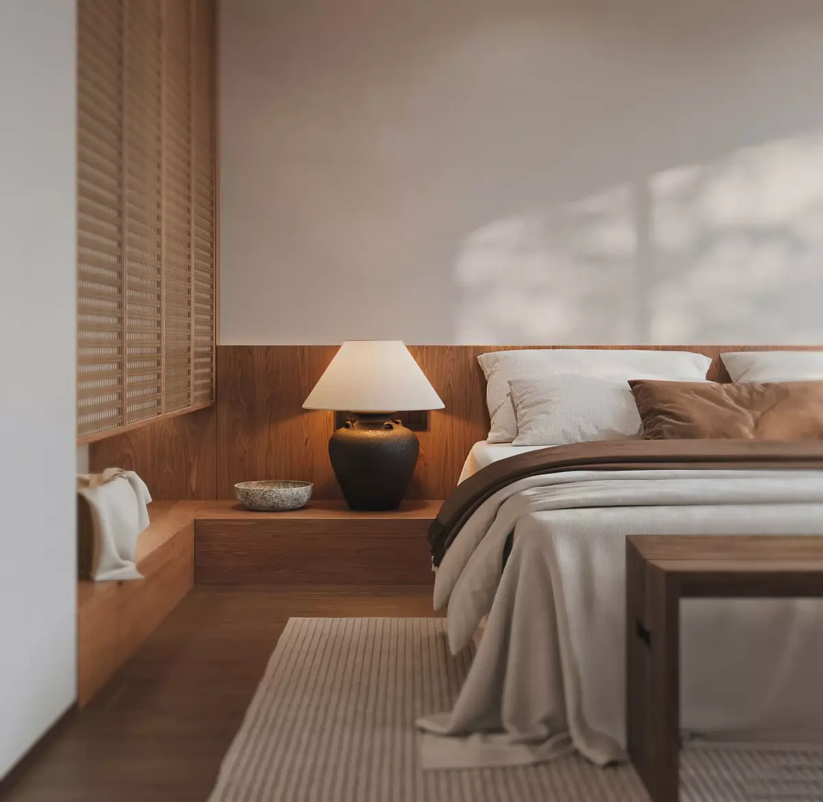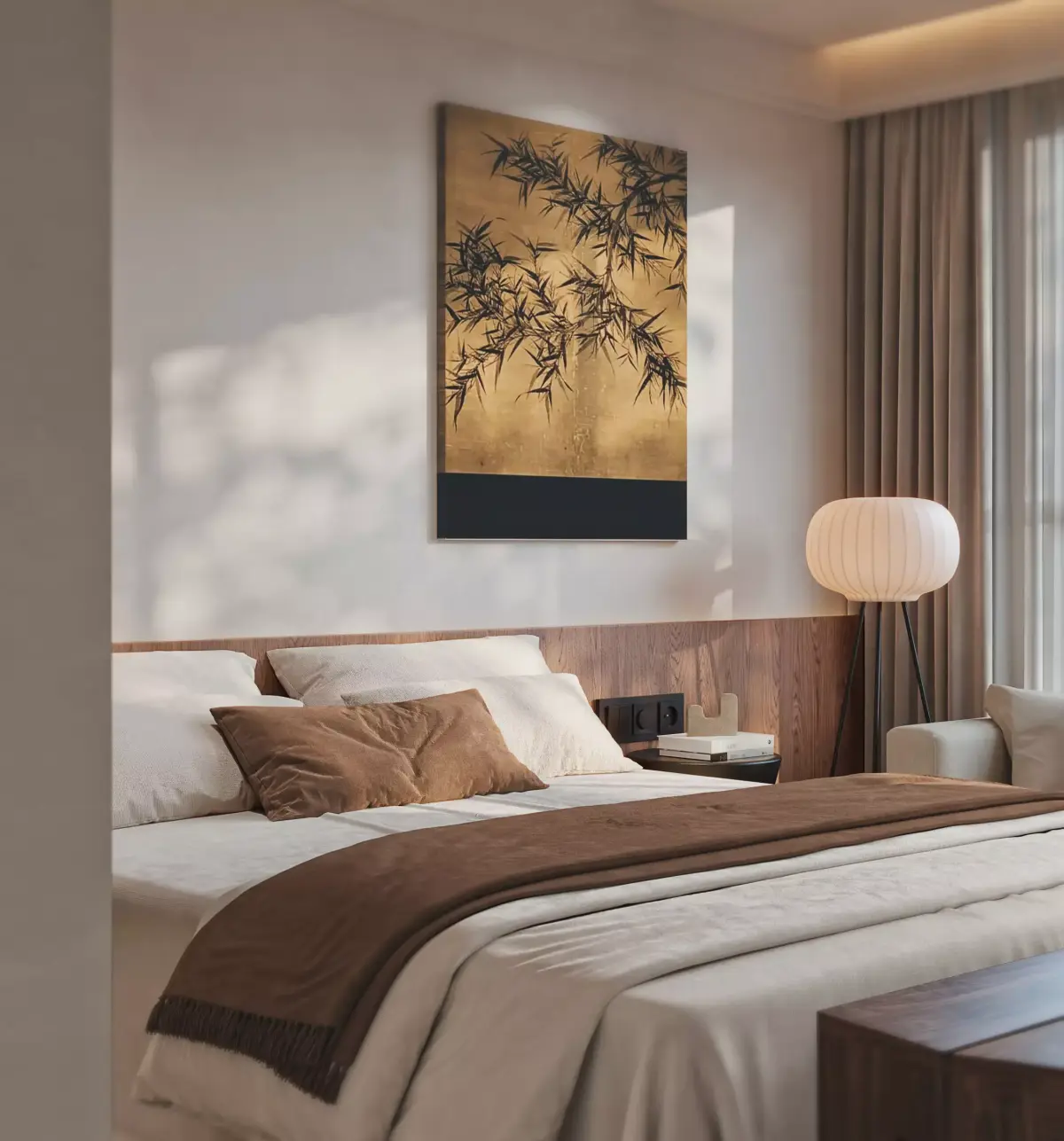 Modern Asian Twin-Bed Suite - Warm Wooden Japandi Bedroom 3D model