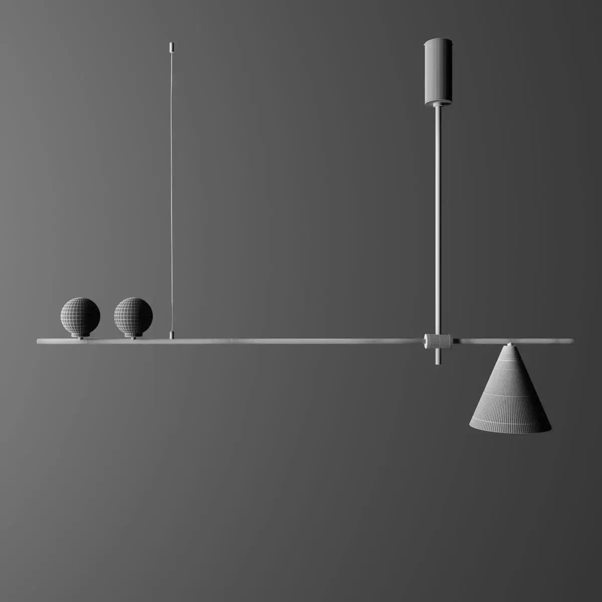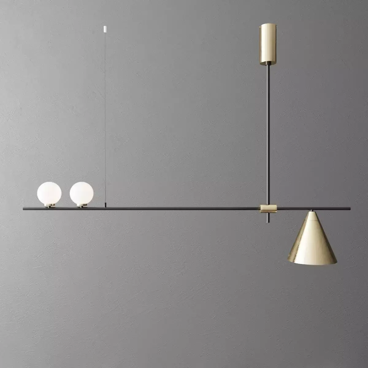 Elevate your modern interior visualizations with this striking, asymmetrical linear pendant light. Featuring a sleek matte black suspension bar beautifully contrasted by brushed brass accents, dual frosted glass globe bulbs, and a geometric conical shade, this fixture is the perfect statement piece for contemporary dining spaces, kitchen islands, or sophisticated office setups. Fully optimized and render-ready for seamless integration into your 3ds Max workflows using Corona or V-Ray, this high-quality, photorealistic model provides pristine lighting and an instant touch of modern luxury to your high-end ArchViz scenes.