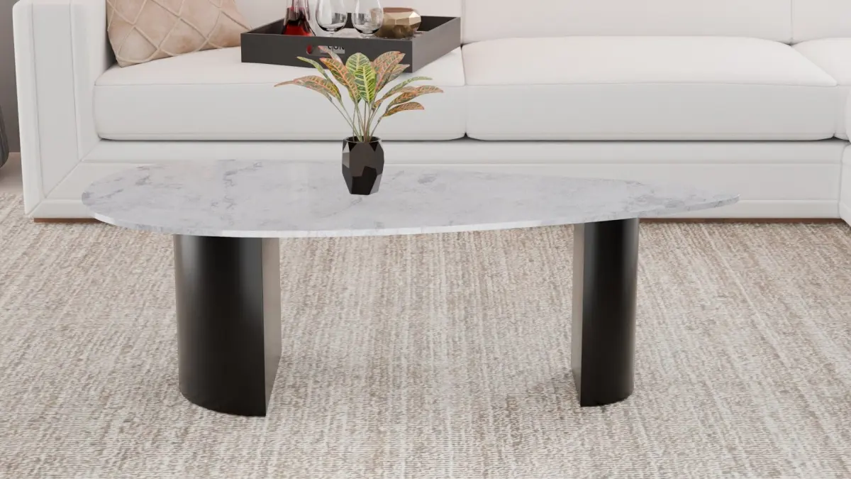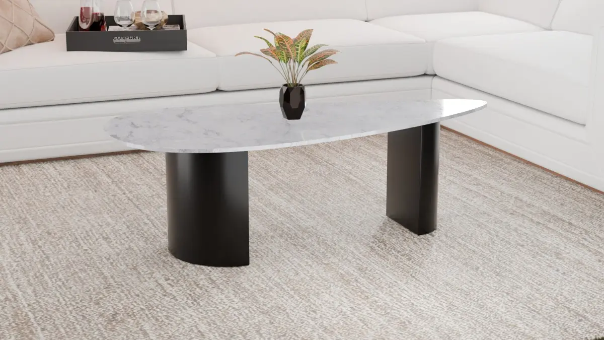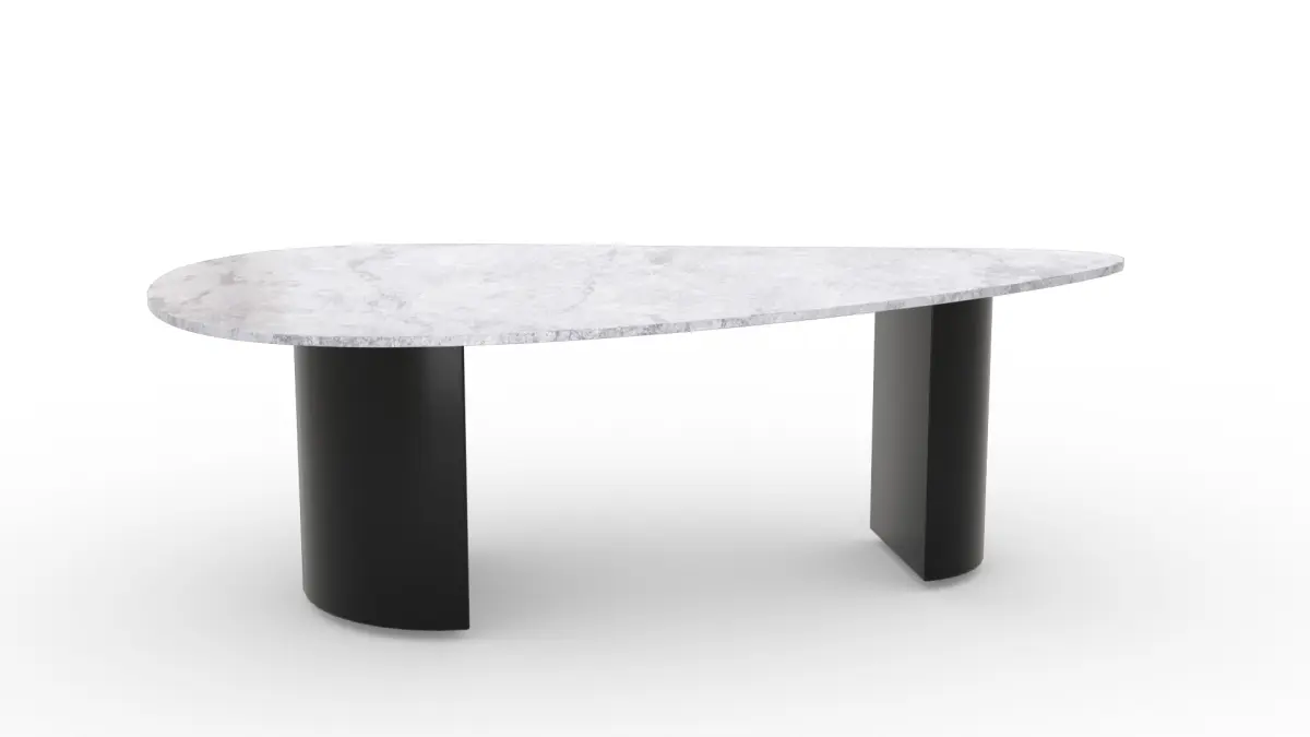 This high-quality 3D model represents a modern asymmetrical coffee table with a sleek, organic design. The table features a unique, teardrop-shaped marble tabletop with a smooth, polished surface, supported by two sturdy black metal legs for a bold contrast. The design is minimalist yet elegant, making it a perfect addition to contemporary interior visualizations, architectural projects, and luxury furniture renders.