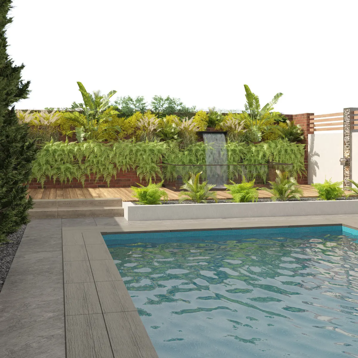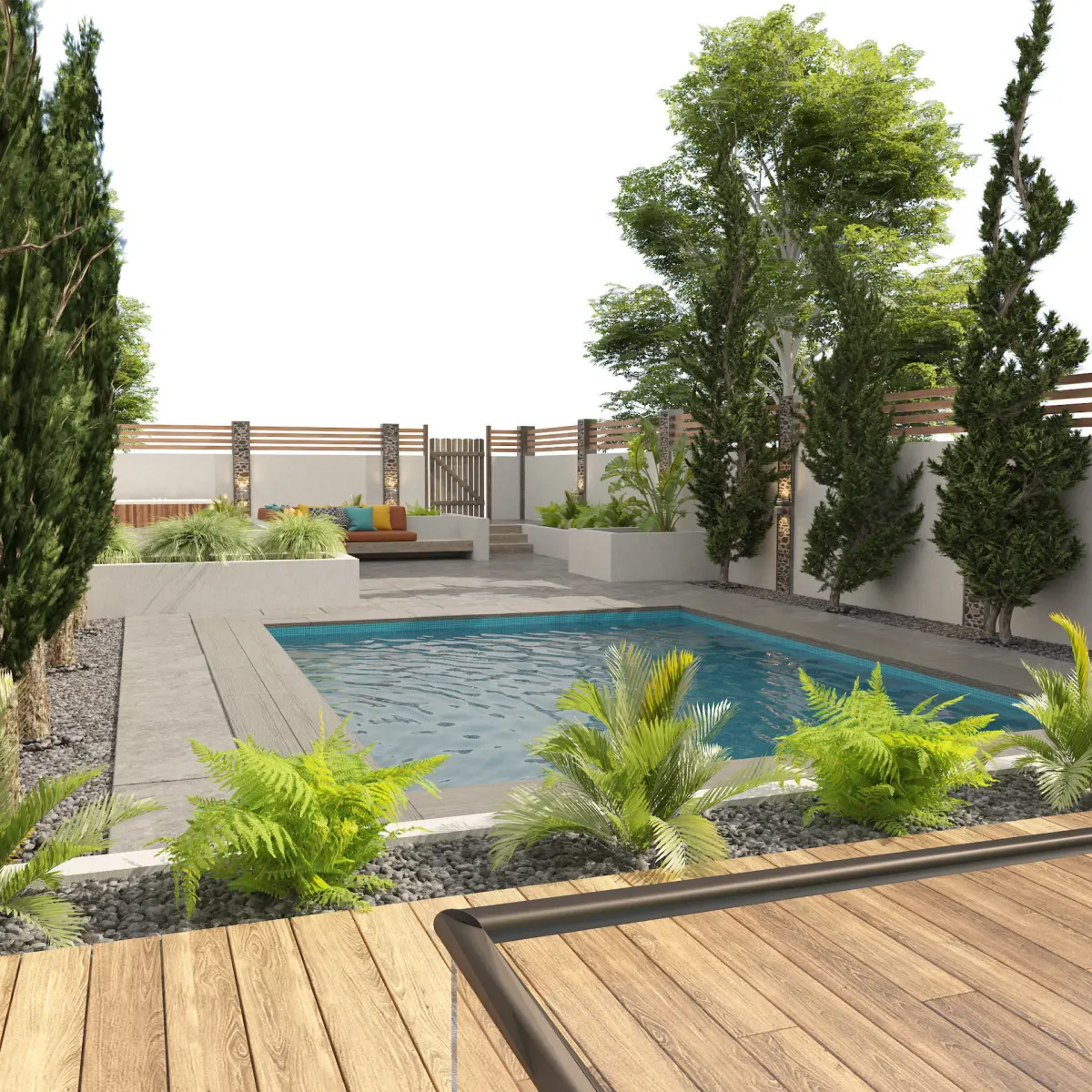 Highly detailed 3d model of modern garden landscape, perfect to use in house backyard design, spring and summer exterior, park, public and private garden with outdoor furniture, made with models created as a separate unit then assembled in garden and backyard model, which if necessary can be blocked in different garden shape or used separately.3d scene with lighting and cameras render to render